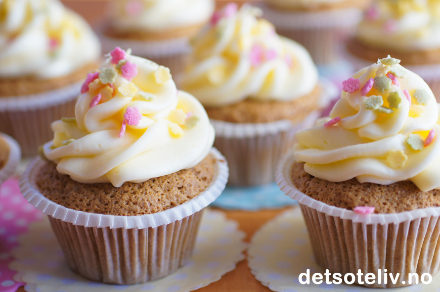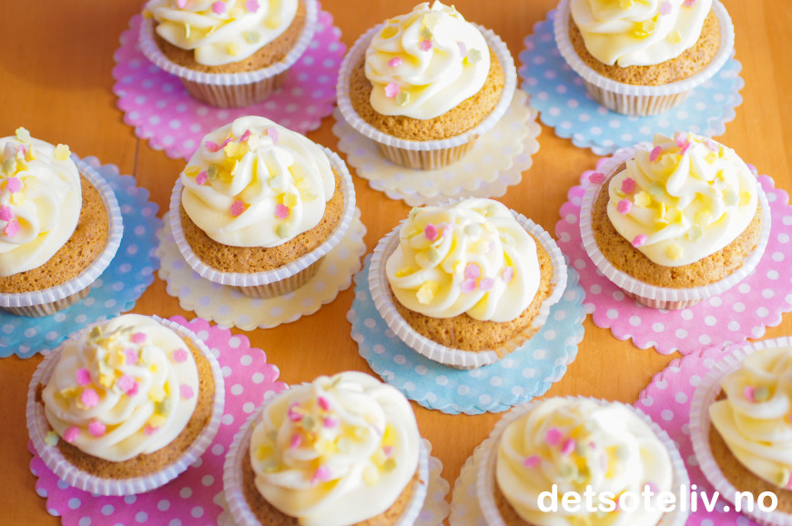 Sprøyt ostekremen på gulrotmuffinsene i vakre topper. Dryss over ønsket kakestrøssel.