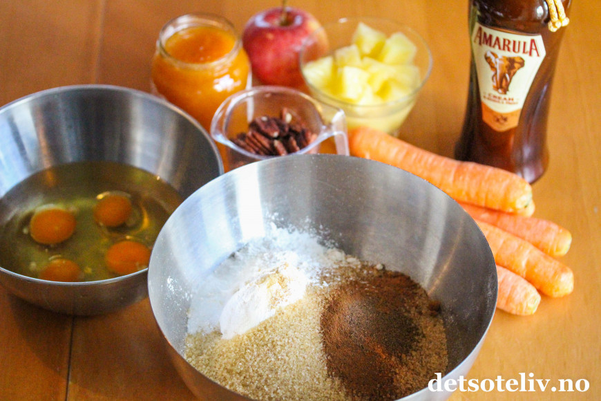 Tilsett revet gulrot. Skrell og rens eplet og riv dette også på et rivjern. Press uten overflødig saft og ha i deigen. Hell fruktsaften av ananasen og del den i små biter. Ha ananasbitene (uten saften) i deigen. Tilsett også aprikossyltetøy, hakkede nøtter og Amarula.