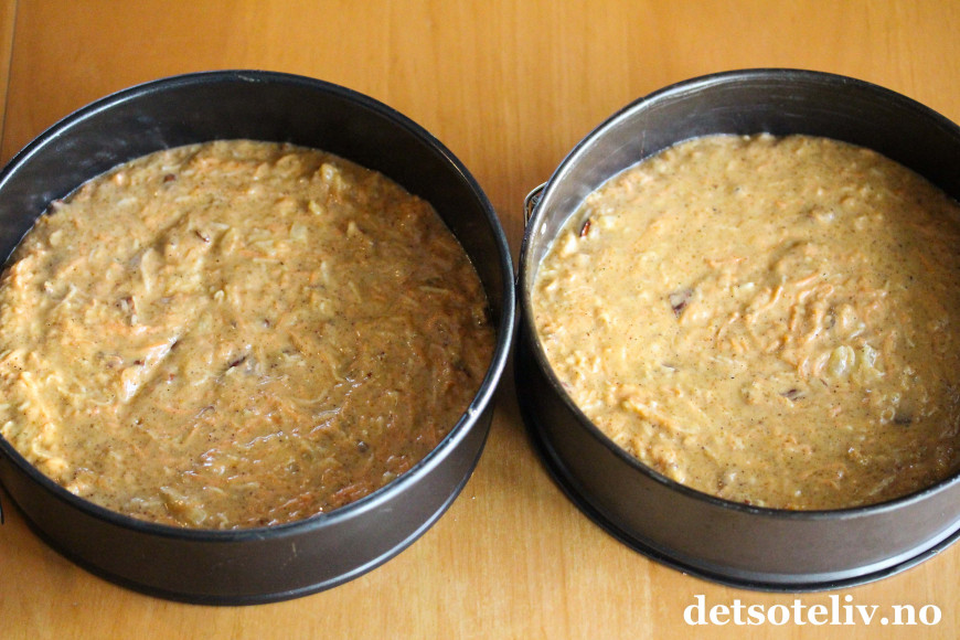 Fordel deigen i to runde former (24 cm i diameter) med bakepapir i bunnen.