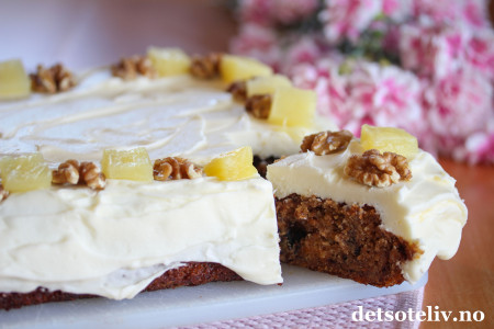 Her har du en klassisk, amerikansk gulrotkake, som inneholder knust ananas og hakkede valnøtter.