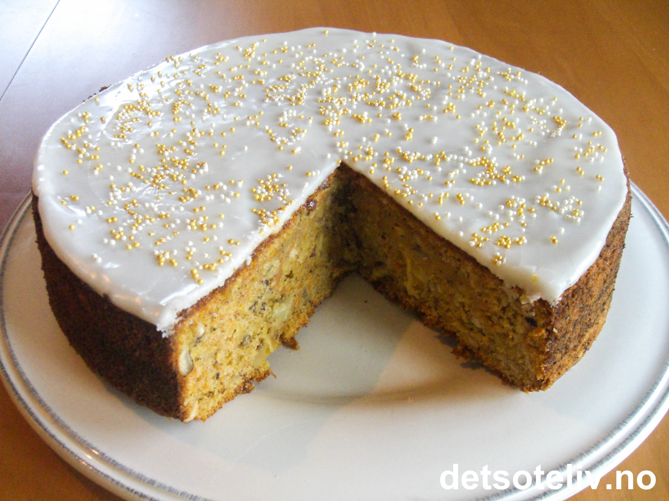 Ha deigen i en rund kakeform (24 cm i diameter) med bakepapir i bunnen. Stek kaken på rist nederst i ovnen ved 175°C i ca 50 min (sjekk med en kakenål at kaken er gjennomstekt). Avkjøl kaken helt i formen. Løsne den fra formen og fjern bakepapiret. Sett kaken på et passende fat.
