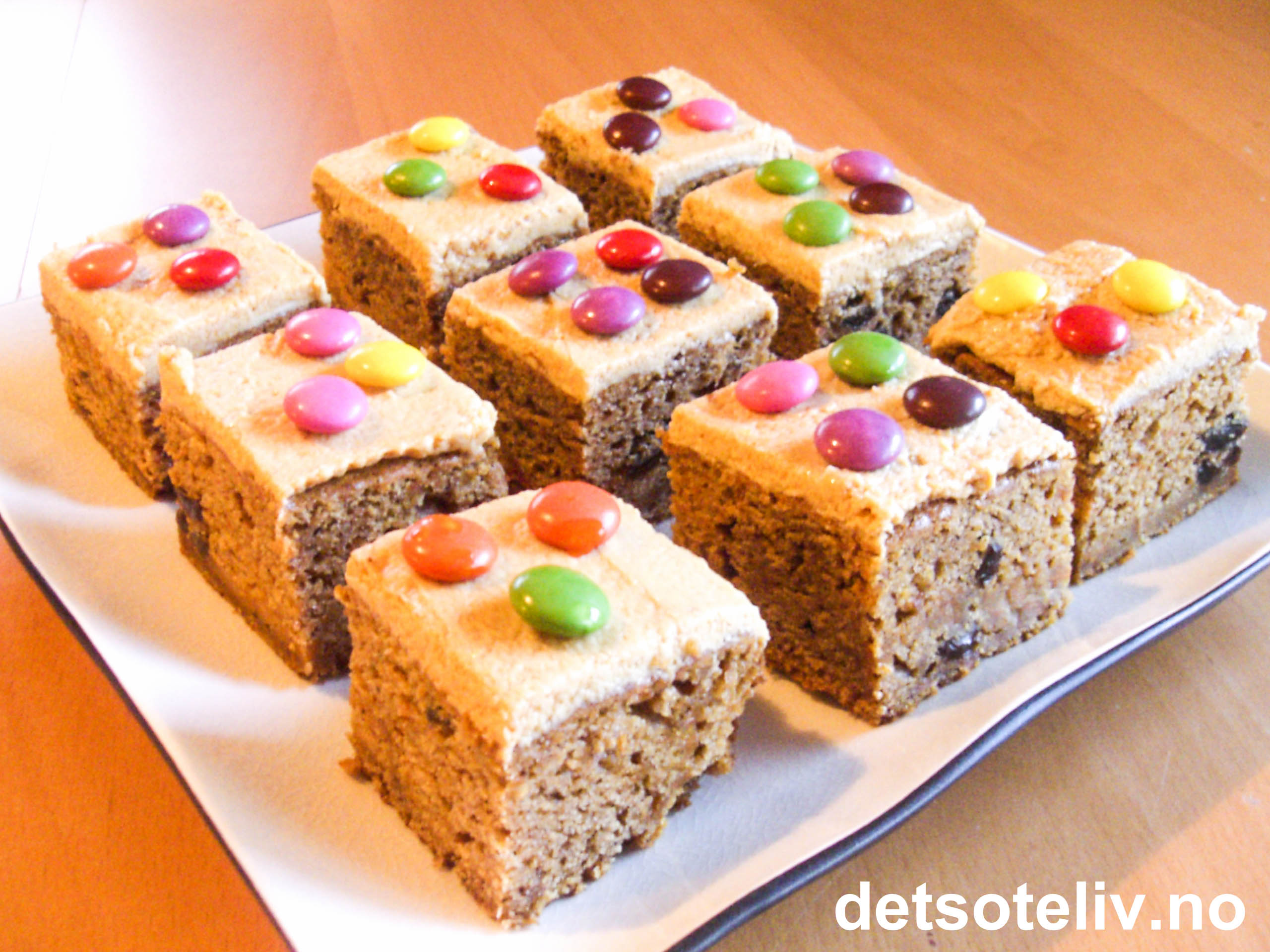 Pisk sammen alle ingrediensene til glasuren til den er luftig. Smør glasuren jevnt på kaken. Del kaken opp i firkanter og pynt med Smarties.