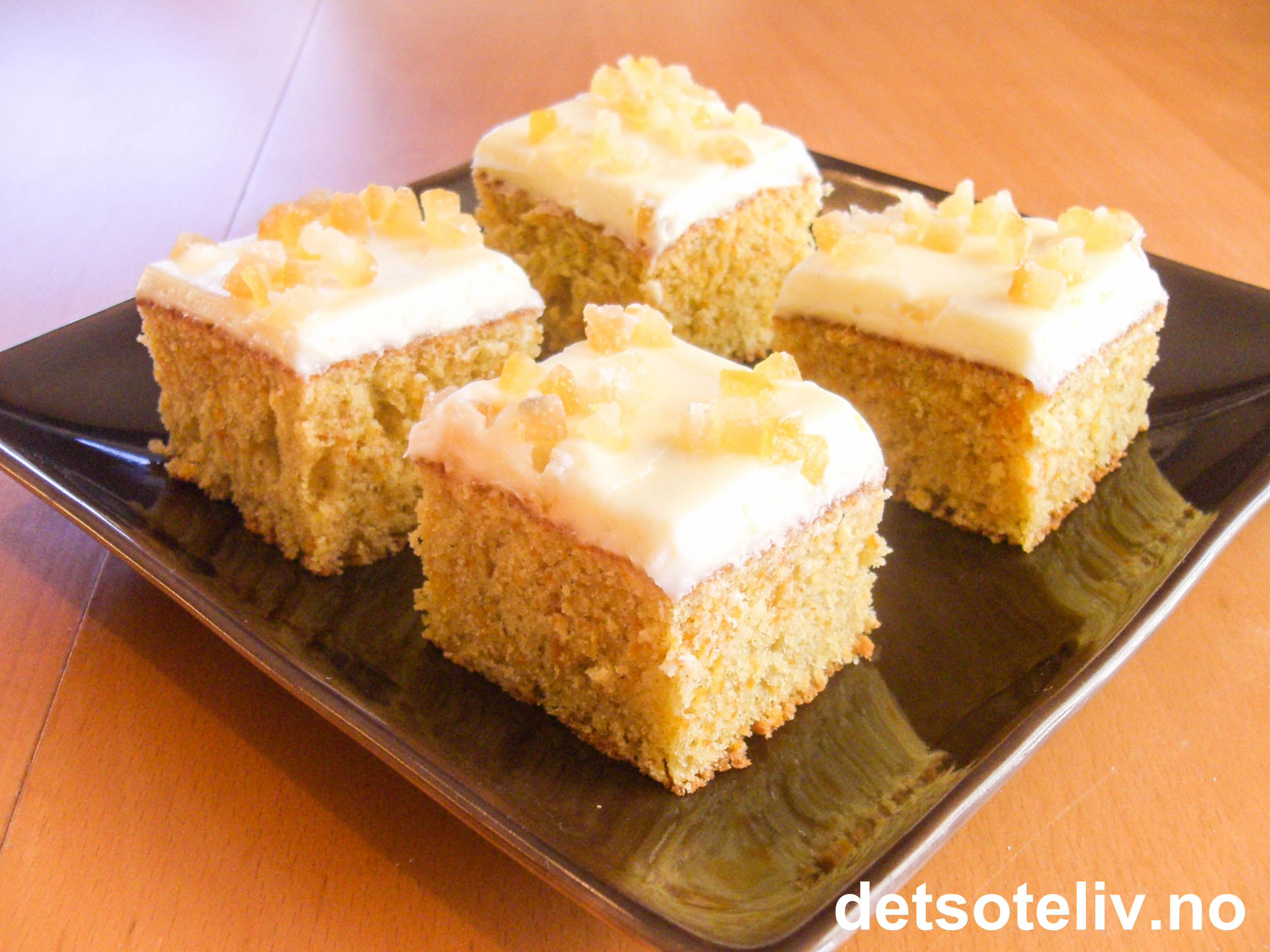 Ha deigen i en liten, bakepapirkledd langpanne (ca 20x30 cm). Stek kaken nederst i ovnen ved 200°C i 20-30 min. Avkjøl kaken helt i formen. Ta den ut og fjern bakepapiret.