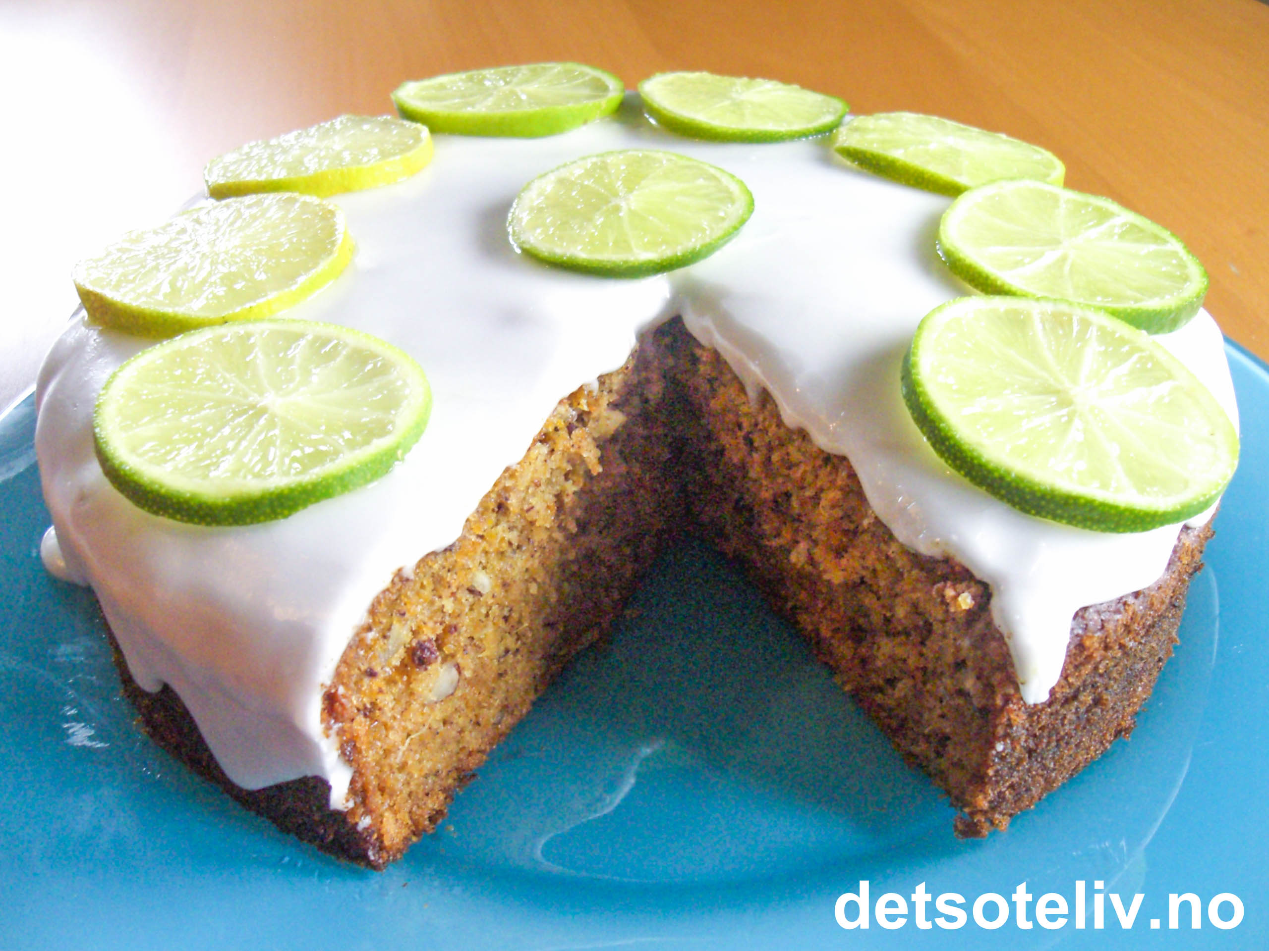 Rør sammen en tykk glasur av melis og limesaft. Smør glasuren over kaken. Pynt med skiver av lime.