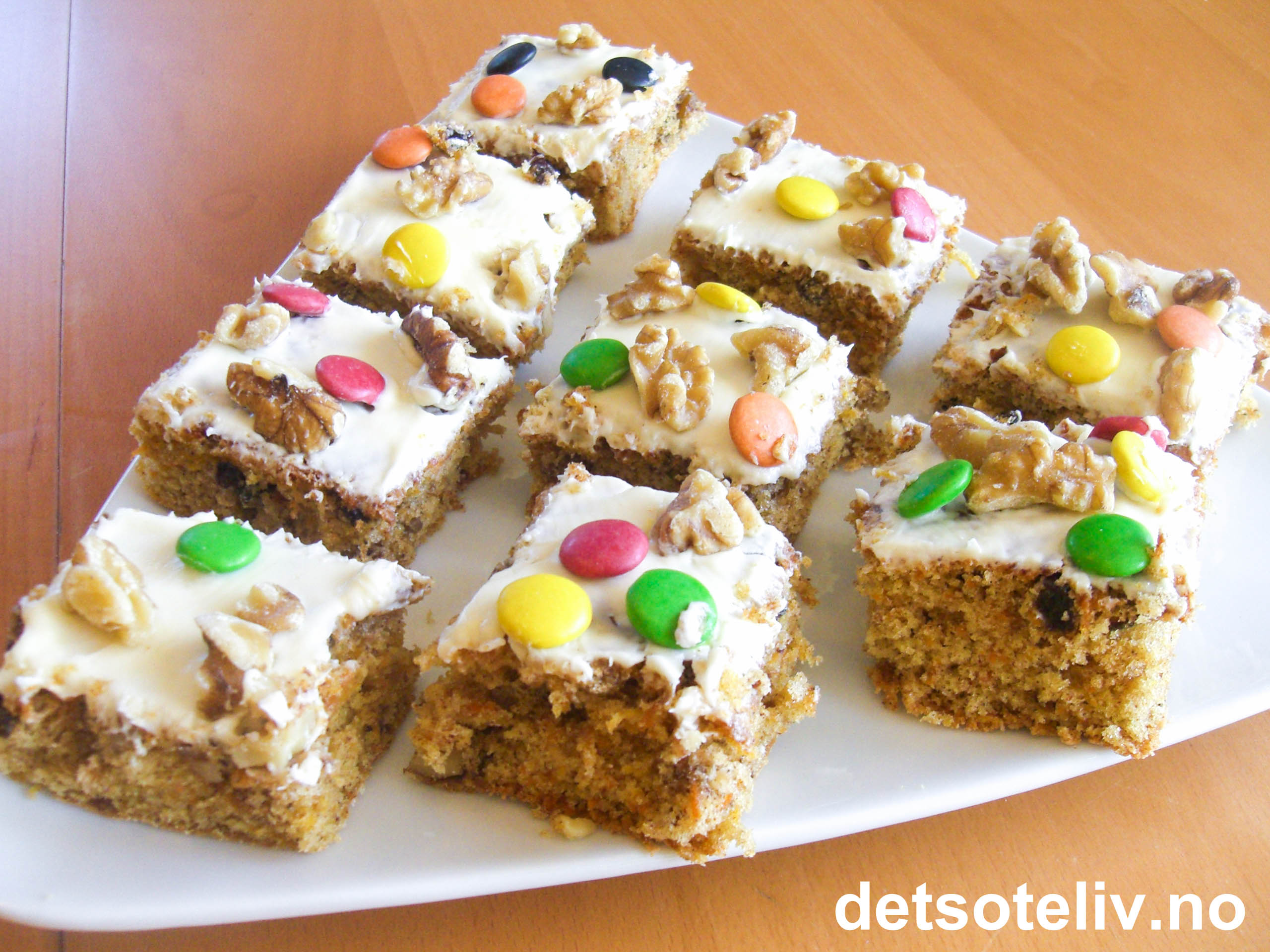 Vil du lage en gulrotkake i langpanne uten nøtter og rosiner, se oppskriftene på "Gulrotkake i langpanne" og "Gulrotkake i biter".