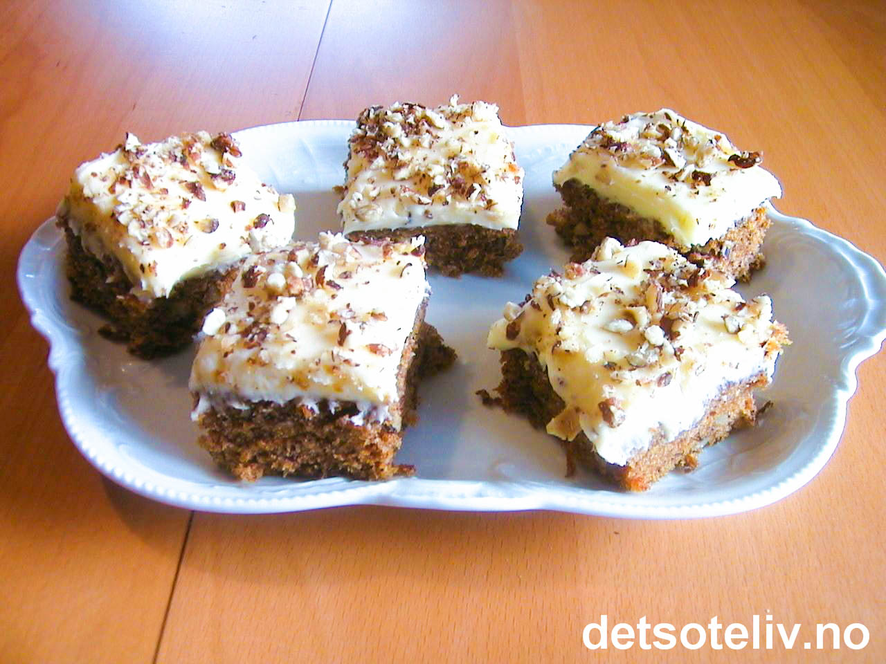 Rør mykt smør og sukker luftig. Pisk inn ett egg om gangen. Sikt sammen hvetemel, natron, kanel og vaniljesukker. Ha det tørre i smørkremen. Bland i hakkede nøtter. Riv gulrøttene fint og rør inn i deigen til slutt.
