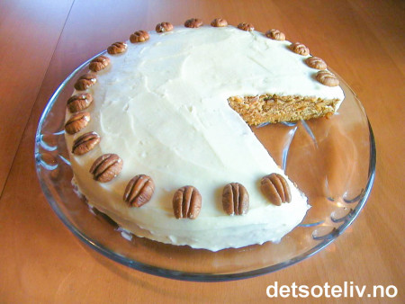 Rør sammen mykt smør, sukker og brunt sukker. Tilsett ett egg om gangen under pisking. Rør i kefir. Sikt sammen det tørre og bland i. Riv gulrøttene fint og bland i deigen. Plukk ut 20 pene pecannøtter og hold av til pynt. Hakk resten og bland i deigen.