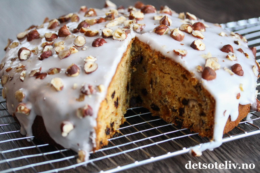 Romglasur gir en helt spesiell touch på denne saftige, mektige og kjempegode gulrotkaken, som dessuten inneholder både kanel, rosiner og hakkede nøtter!