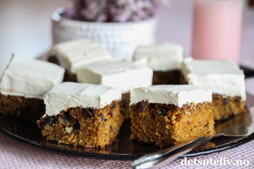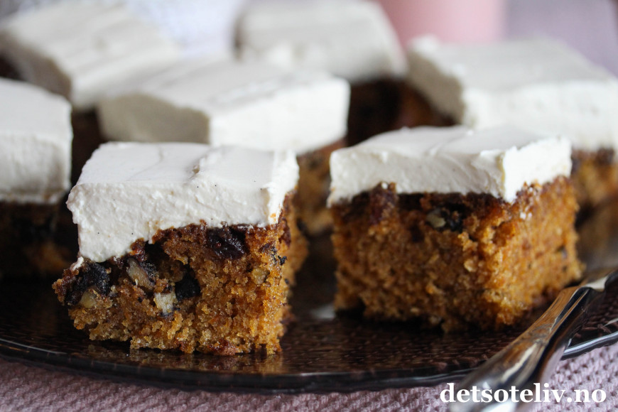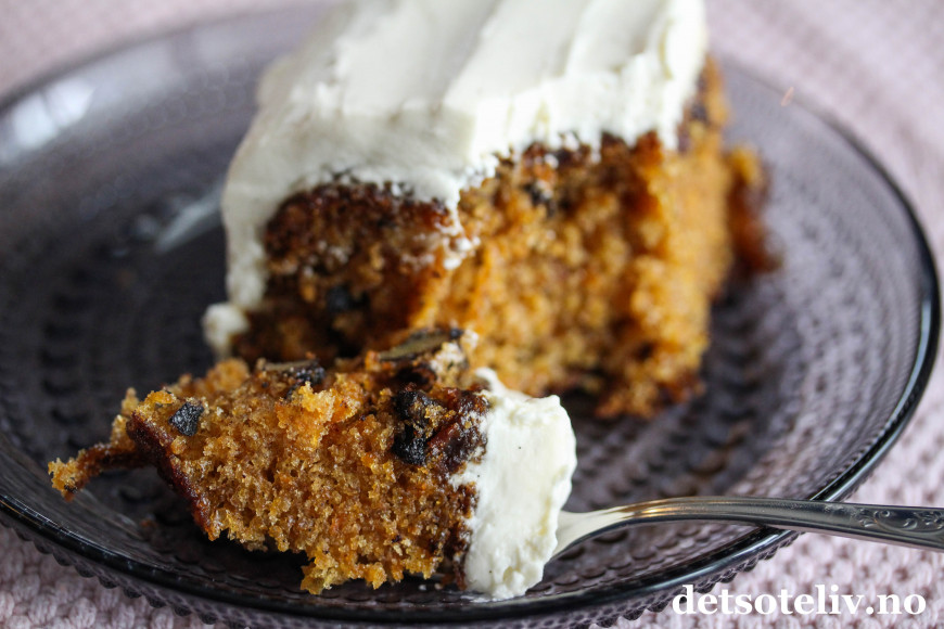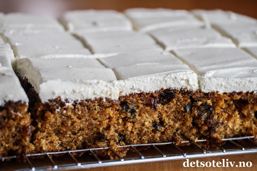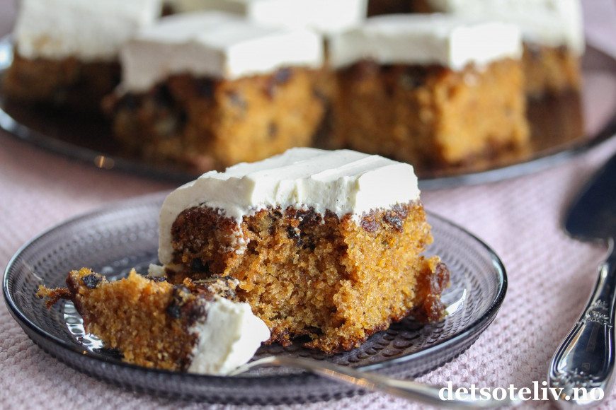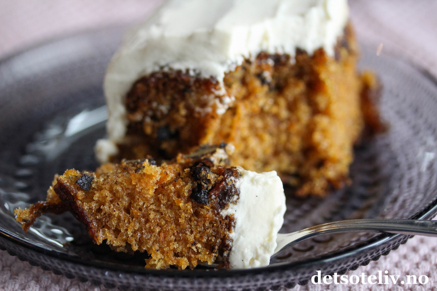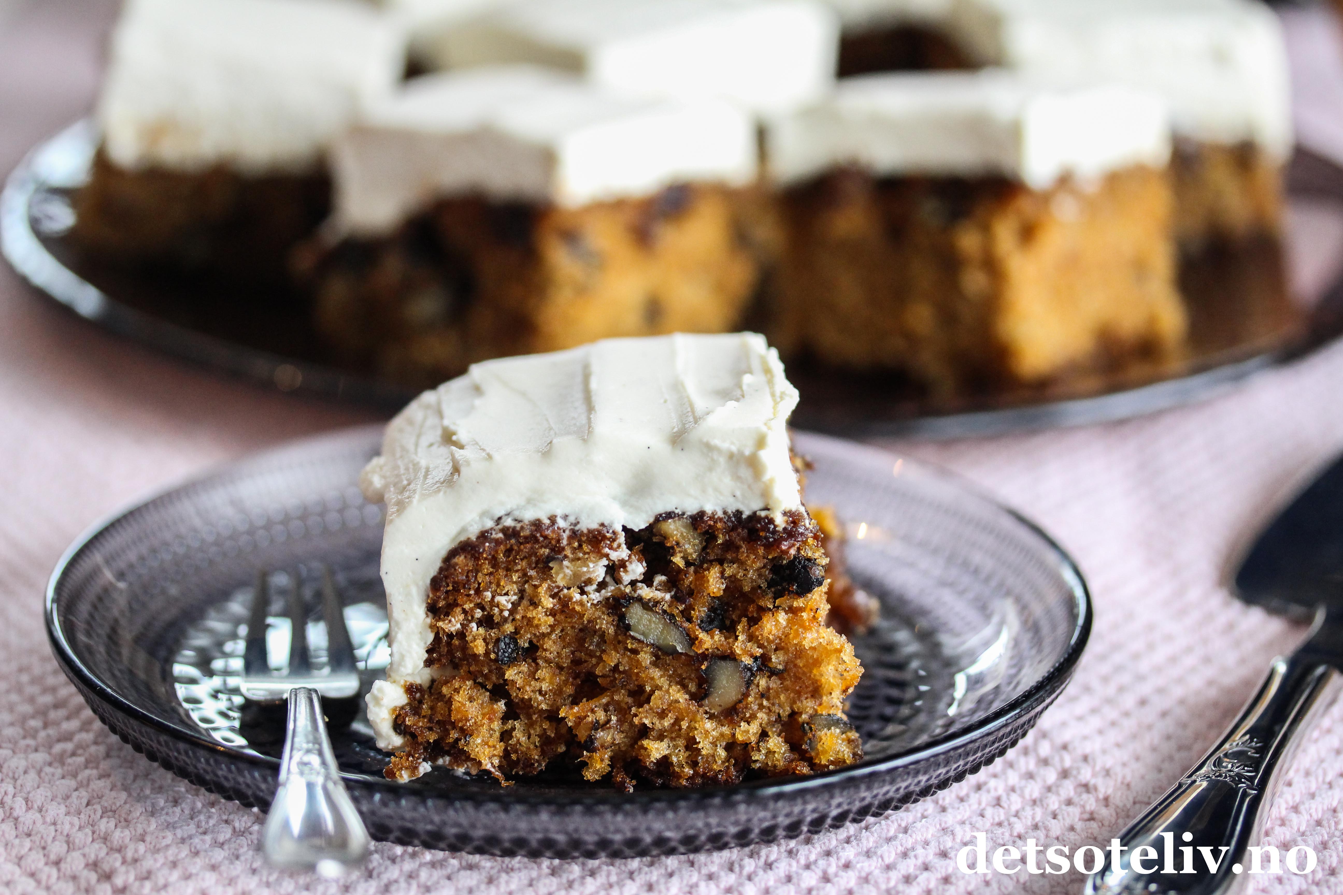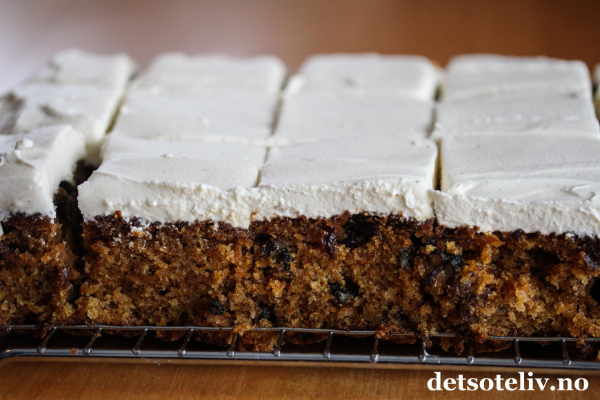 Dette er en saftig gulrotkake med valnøtter og rosiner som dekkes med et tykt lag luftig mascarponekrem. Mascarponekremen blir luftigere enn den klassiske ostekremen og smaker deilig av vanilje.