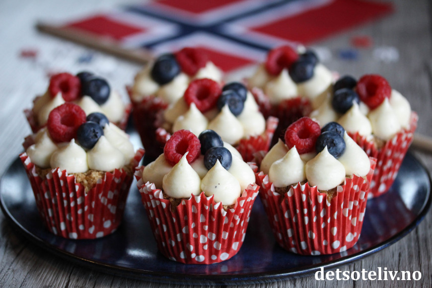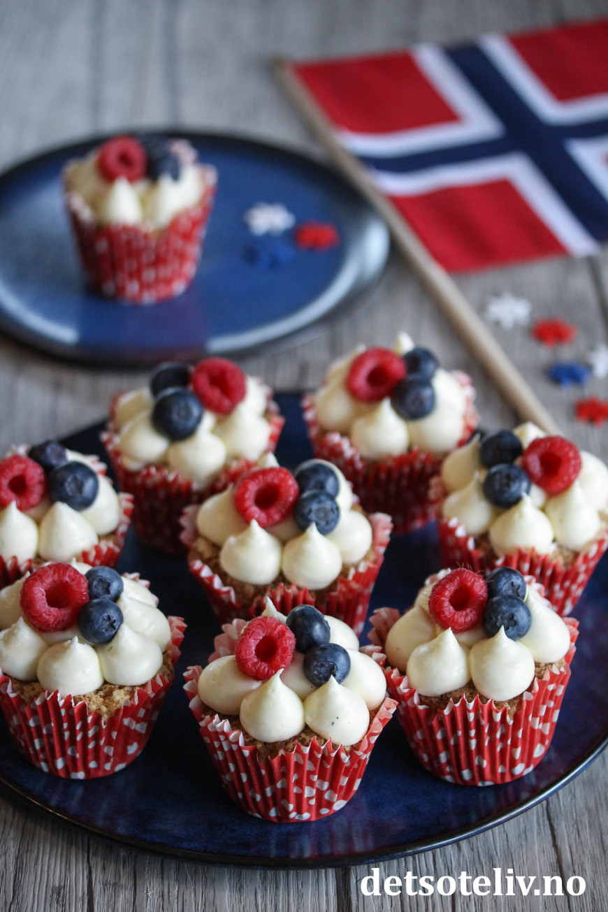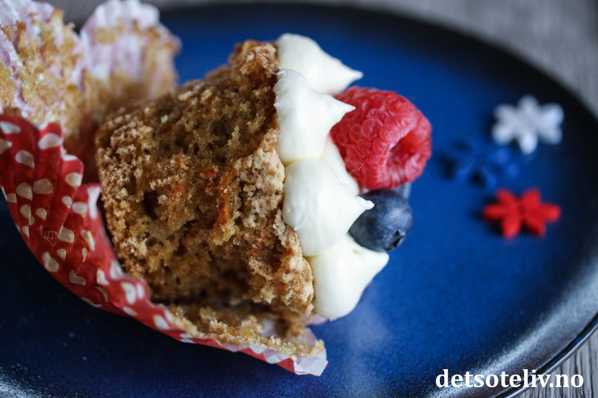 Myke gulrotmuffins med ostekrem og friske bær er superfine å servere til 17. mai!