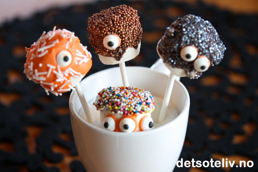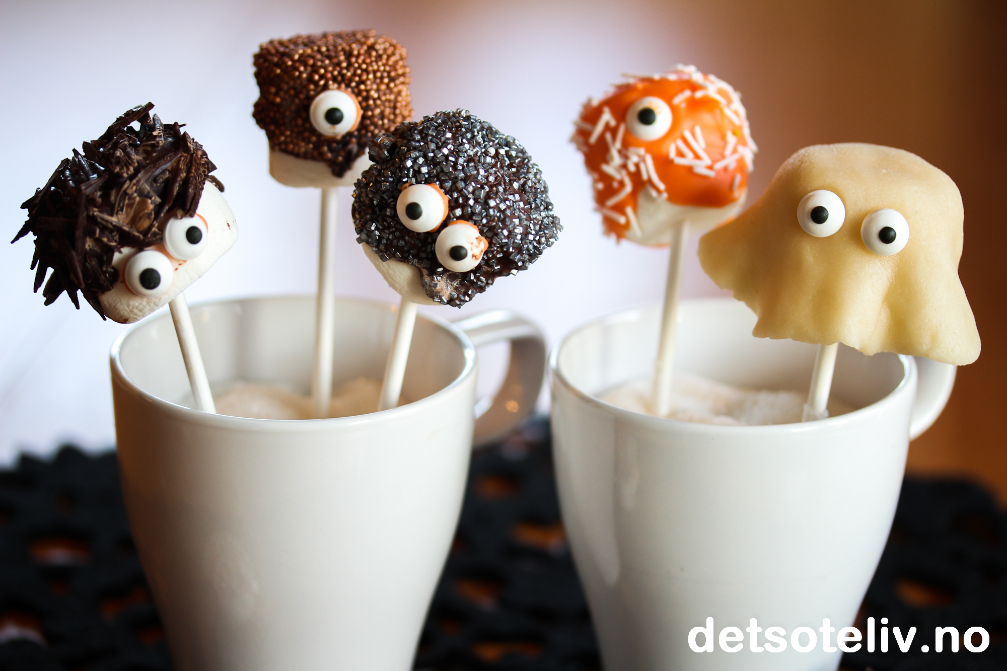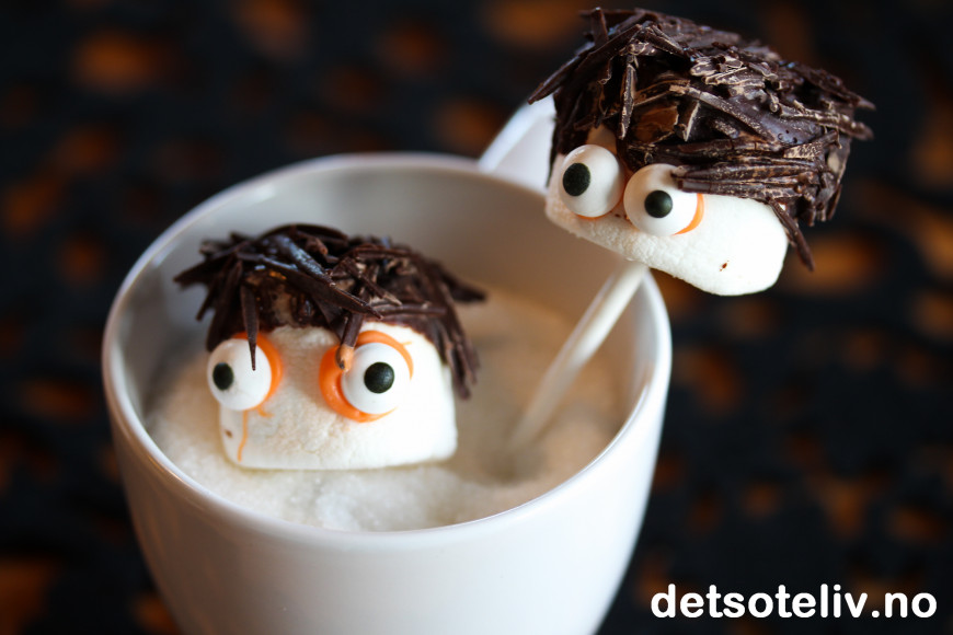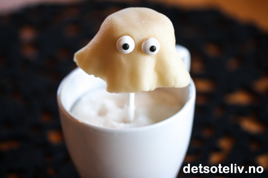 Søte spøkelser får du ved å klemme ut marsipan til en sirkel og legge rundt marshmallowsen. Øyene klemmes godt fast, så sitter de av seg selv, eller du kan feste dem ved å ha litt smeltet sjokolade på baksiden.