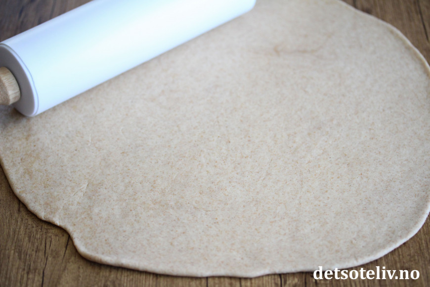 Ha deigen på bakebordet og del den i tre like store deler. Kjevle ut hver del til en stor sirkel.