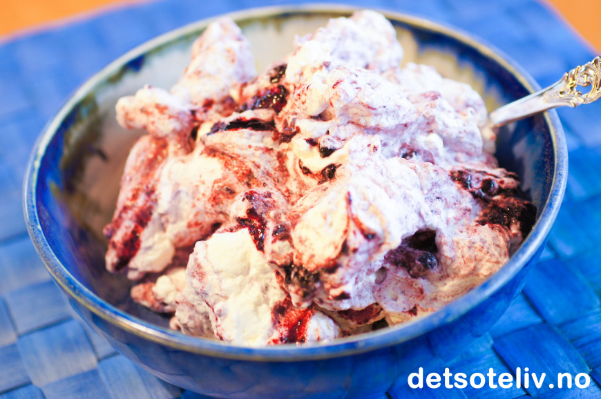 ♥ Denne kaken er litt tørr i konsistensen, og det er slik den skal være. Det er derfor veldig vanlig å servere kaken sammen med krem eller crème fraîche. Du kan smaksette med vaniljesukker, men det blir enda bedre om du blander i syltetøyet som du også har brukt inni kaken. Jeg har her brukt luftig blåbærkrem. Du kan som sagt også blande crème fraîche med blåbærsyltetøy. Kremen ser stilig ut om du bare så vidt blander syltetøyet i kremen, synes jeg. Iskrem er forresten også godt til