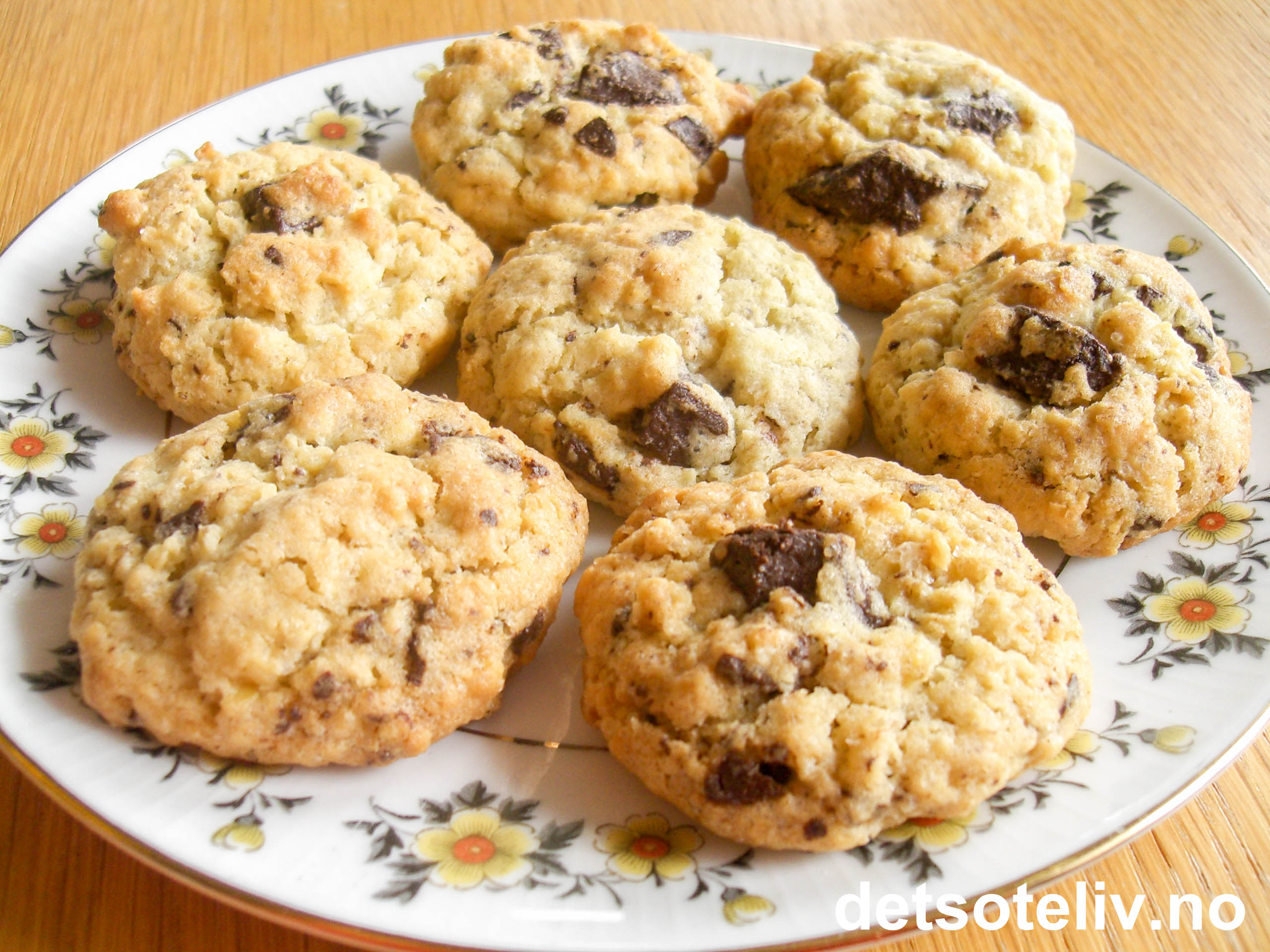 Disse var veldig gode, jeg lagde de ganske store og byttet ut halve sjokoladen med rosiner. Kommer absolutt til å lage igjen:)
