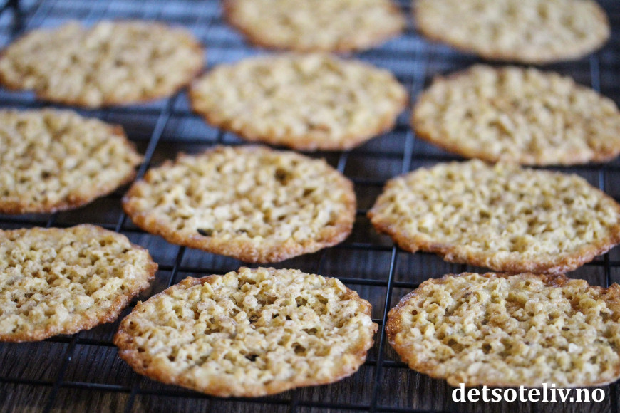 ♥ Det er veldig viktig å følge med på kakene under stekingen, for de trenger bare noen få minutter for å bli ferdigstekte. Særlig på slutten av steketiden går det raskt, så følg godt med. Havreflarn skal være lyse på midten og lysebrune i kantene.