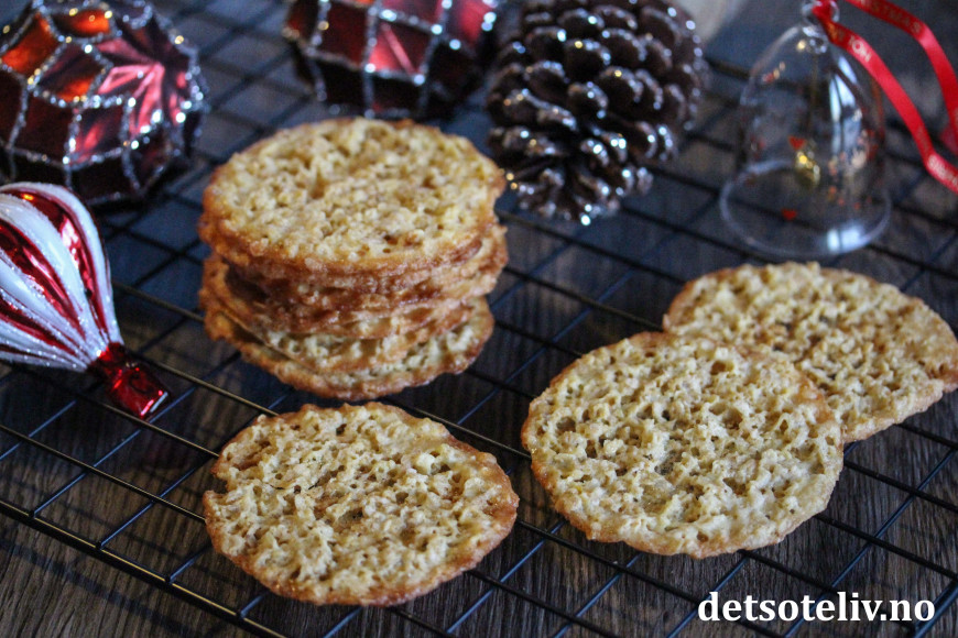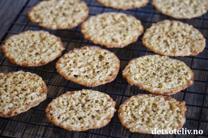 Jeg lagde disse og de ble tynne og crispy akkurat som lovet i oppskriften. Stekte dem mørkere enn bildet, 5 pr brett. Alle ble spist så skal doble oppskriften og spare til jul.