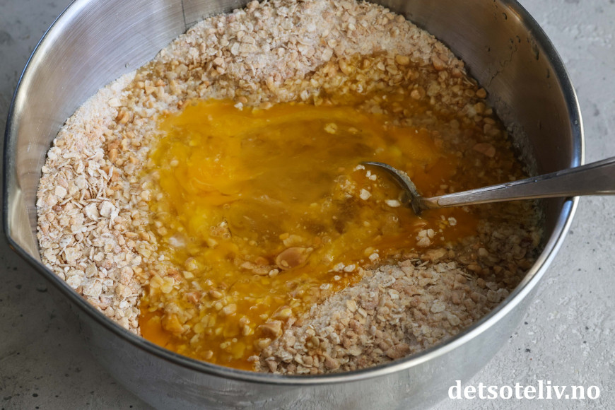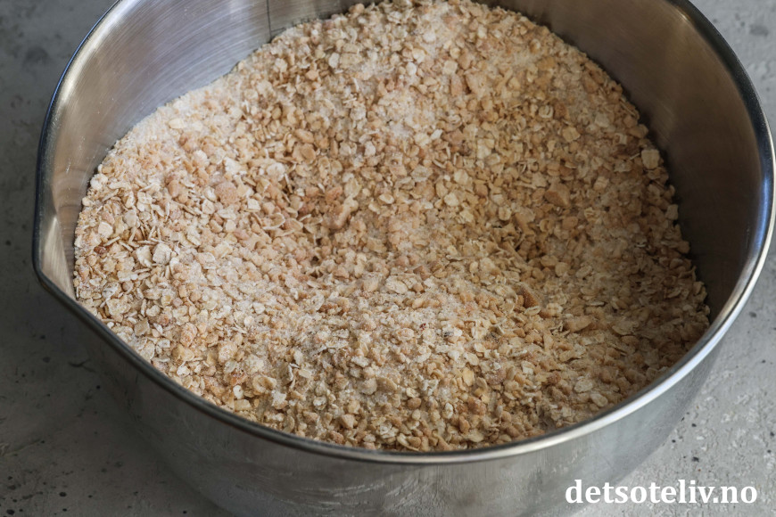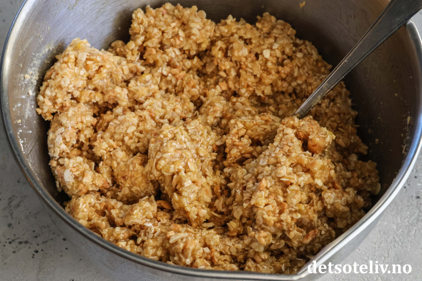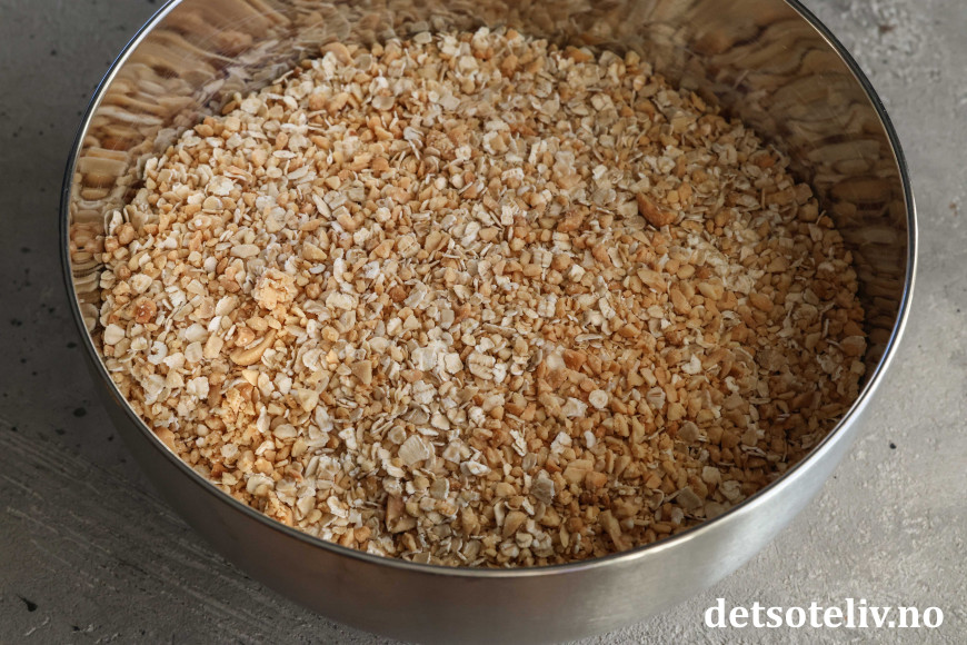 Ha havergryn og peanøtter i en food processor. Kjør sammen til en kornete blanding. Rør inn sukker, hvetemel, bakepulver og vaniljesukker.