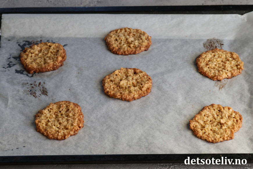 ♥ Husk at kakene flyter mye utover under stekingen. Lag dem derfor ikke for store (1 ts deig per kake er nok) og beregn god avstand mellom kakene på stekeplaten.