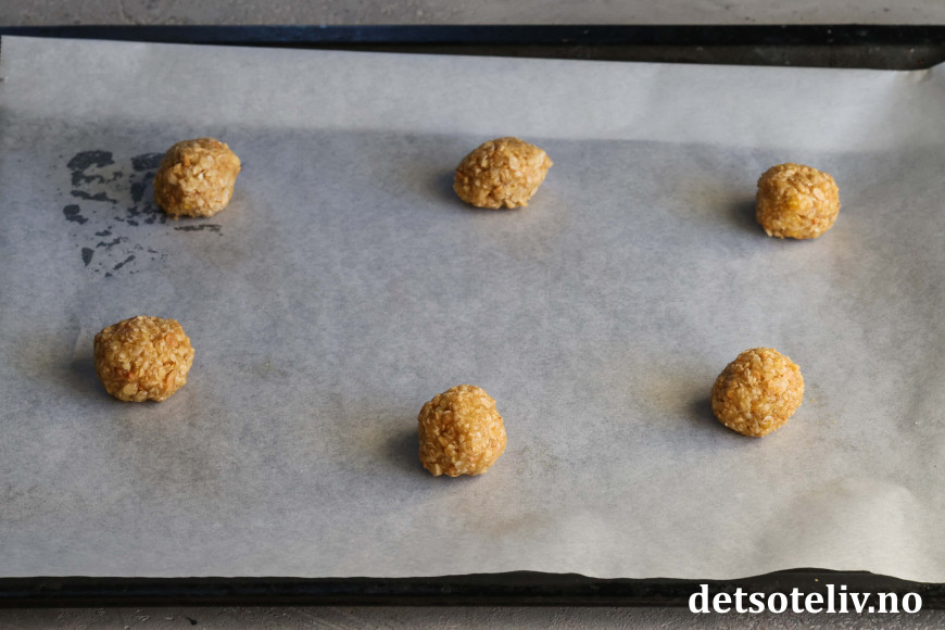 Form teskjestore kuler og sett på bakepapirkledd stekeplate. Kakene flyter mye utover under stekingen, så ikke sett flere enn 9 stykk på hver plate. Vil du være helt sikker på at kakene ikke skal flyte inn i hverandre, steker du bare 6 kaker om gangen.