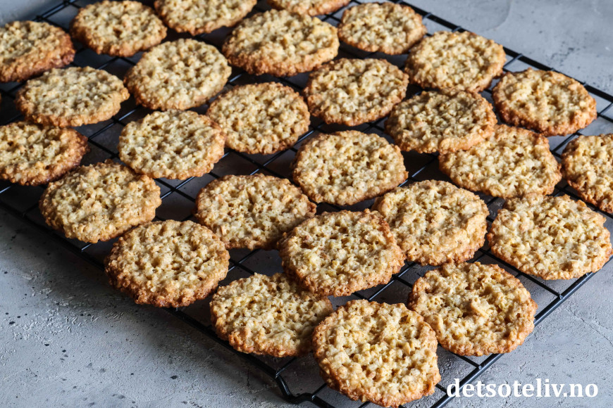 La kakene avkjøles på platen i noen minutter før de forsiktig flyttes over på rist og avkjøles helt.