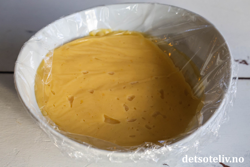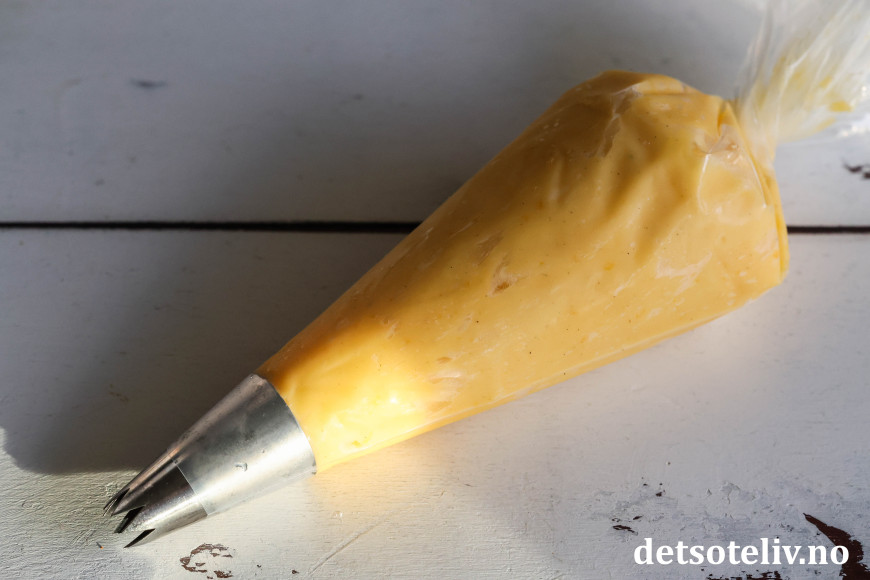 ♥ Du kan gjerne lage klar den gule kremen dagen i forveien. Dekk den til med plast og oppbevar i kjøleskapet. Kremen tykner når den blir kald og blir da lettere å sprøyte.