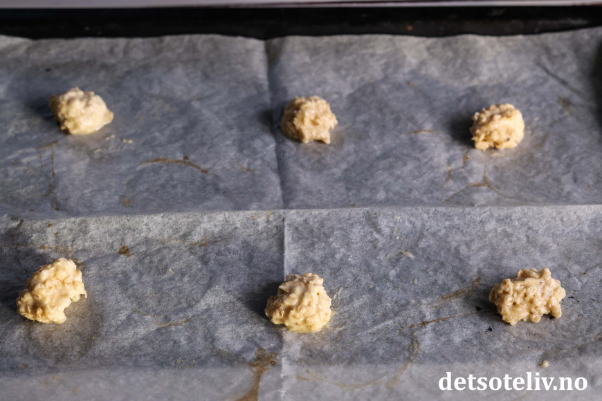 Bruk to teskjeer og lag små klatter av deigen som legges på bakepapirdekkede stekeplater. Ha meget god avstand mellom kakene, for de flyter mye utover under stekingen. Jeg steker ikke mer enn 6 kaker av gangen.