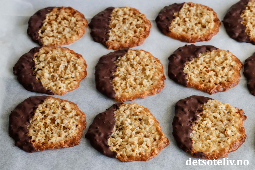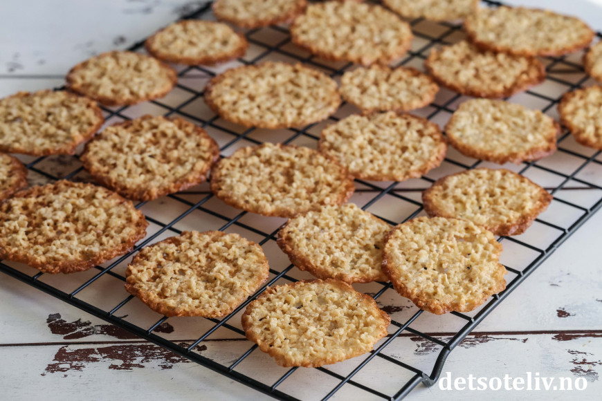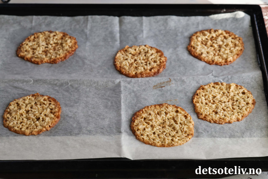 ♥ Det er veldig viktig å følge med på kakene under stekingen, for de trenger bare noen få minutter for å bli ferdigstekte. Særlig på slutten av steketiden går det raskt, så følg godt med. Havreflarn skal være lyse på midten og lysebrune i kantene.