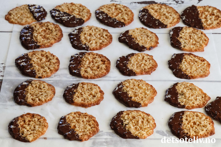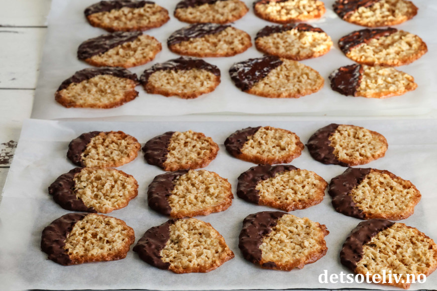 Dypp den ene siden av havreflarnene i den smeltede sjokoladen. Legg havreflarnene deretter på bakepapirdekket brett. Sett brettene i kjøleskapet i ca. 30 minutter til sjokoladen har stivnet.