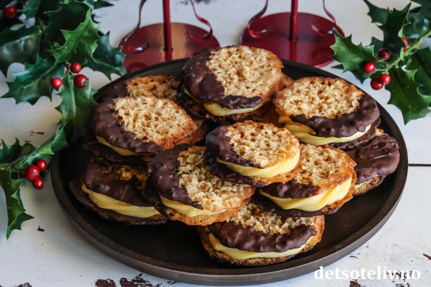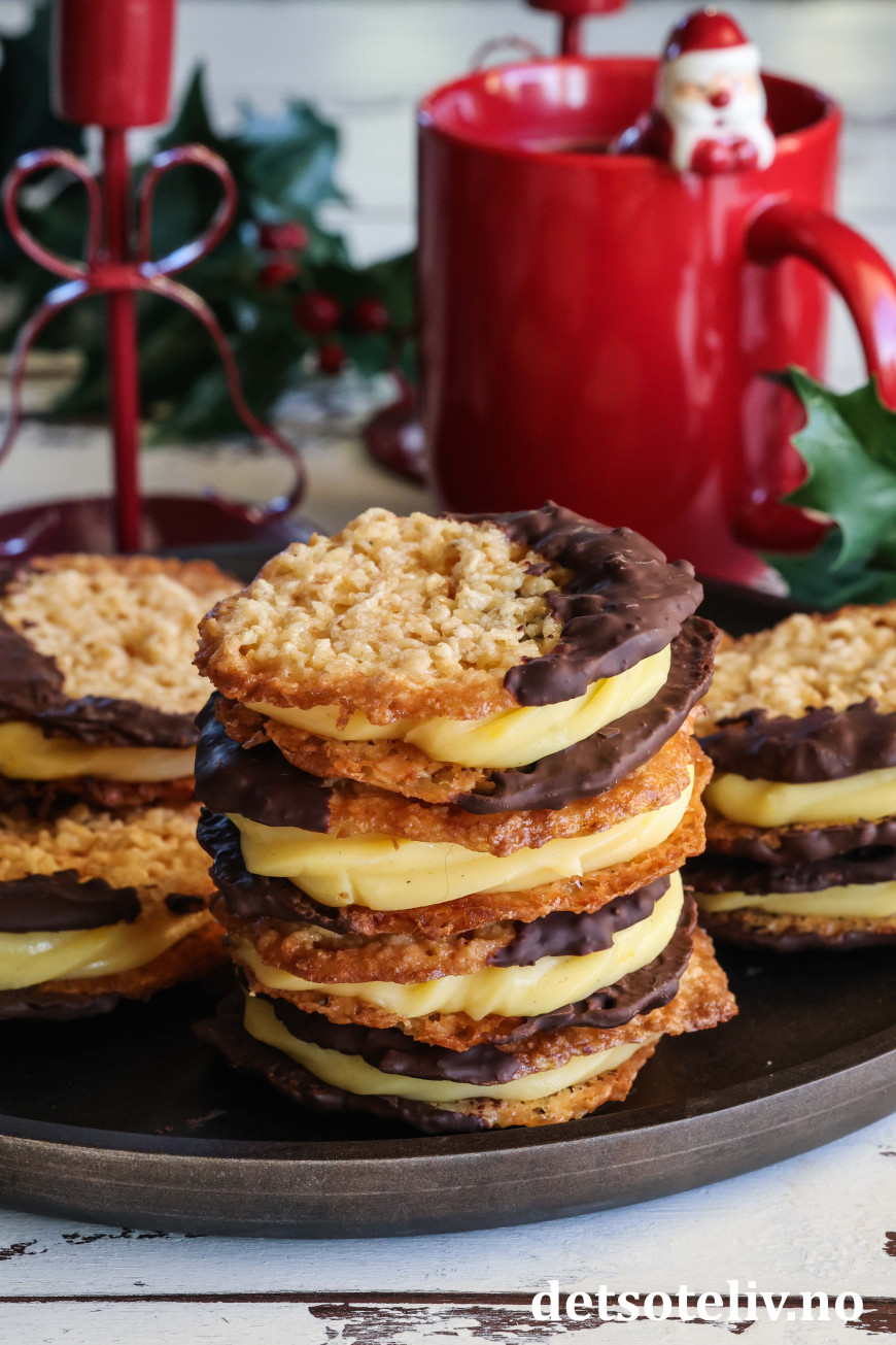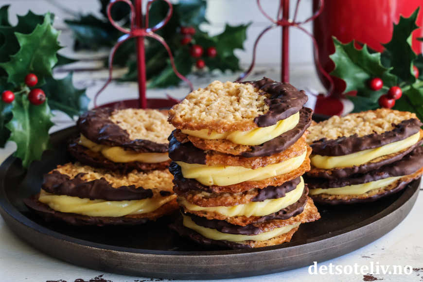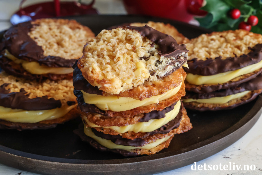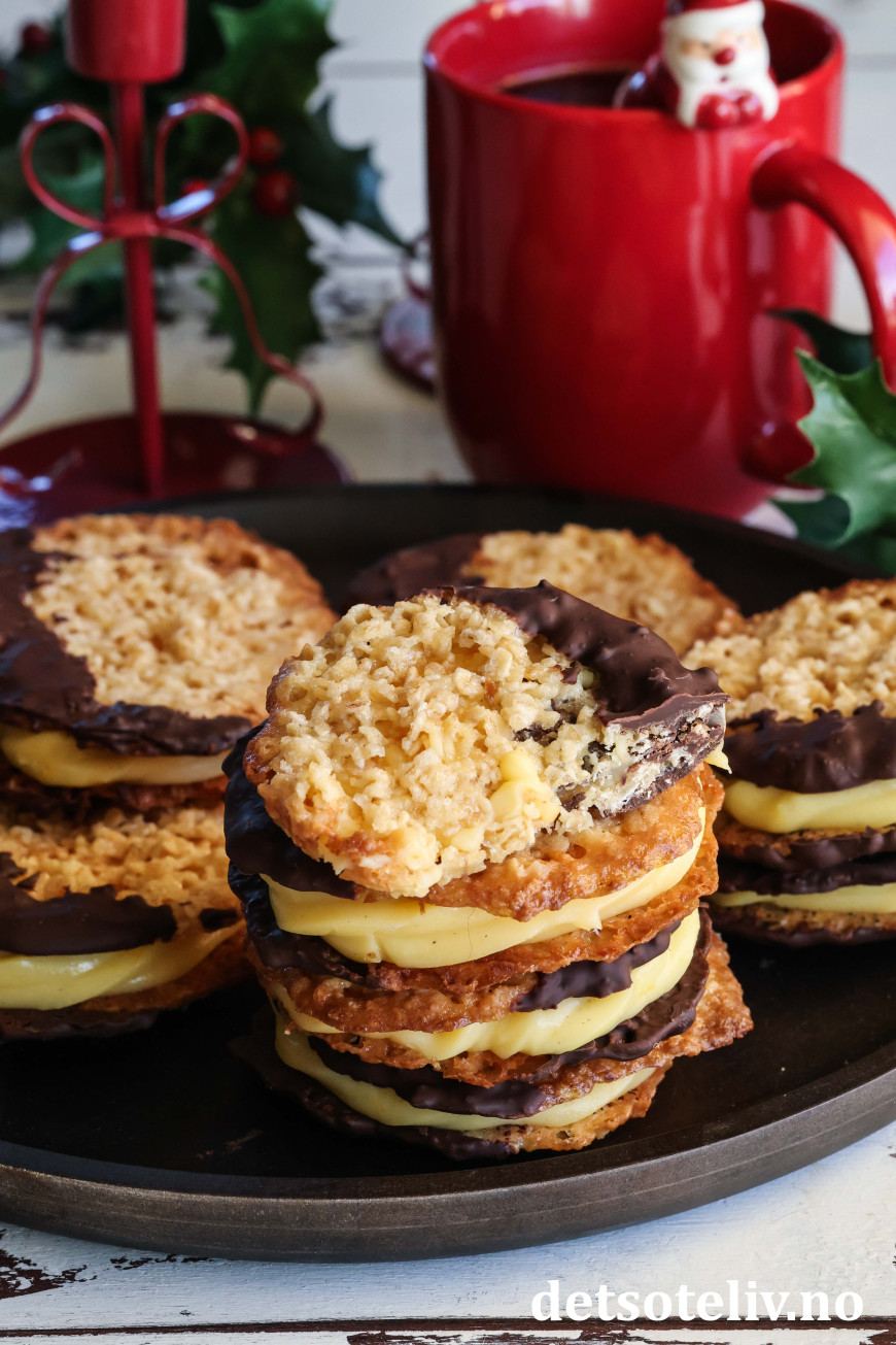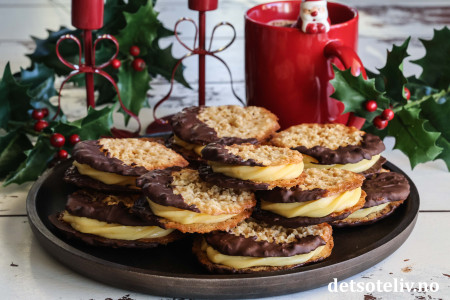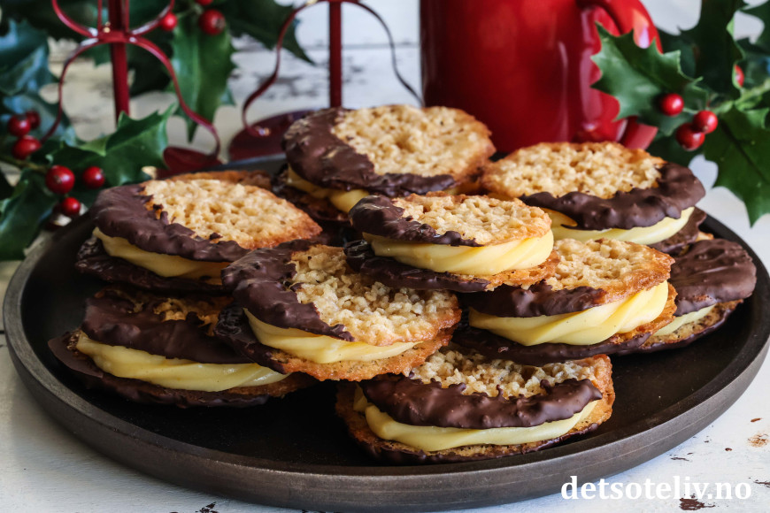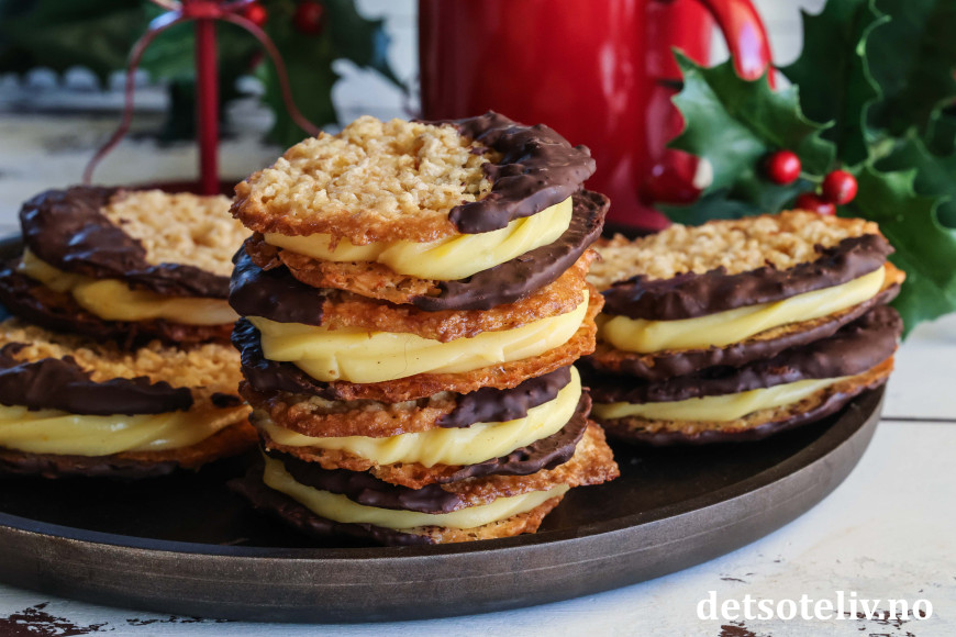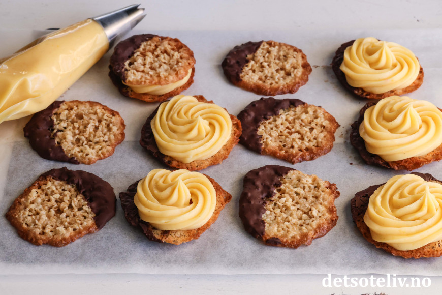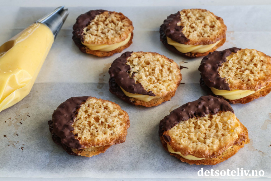 Jeg har brukt min klassiske oppskrift på Havreflarn. Jeg dyppet kakene i smeltet sjokolade etter at de var ferdigstekt. Videre har jeg brukt halv porsjon av den gule suksesskremen som jeg har i Gule bomber som fyll.