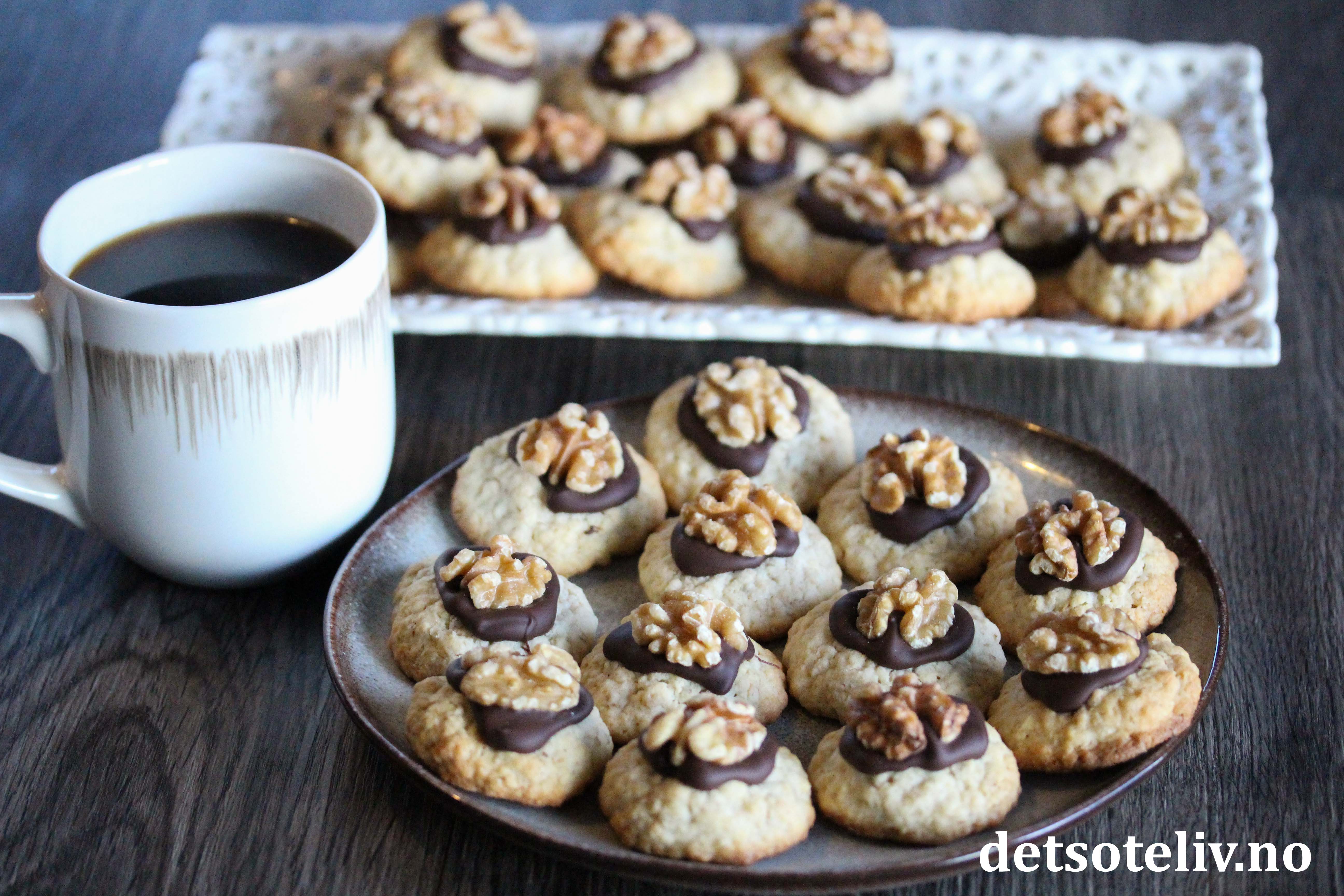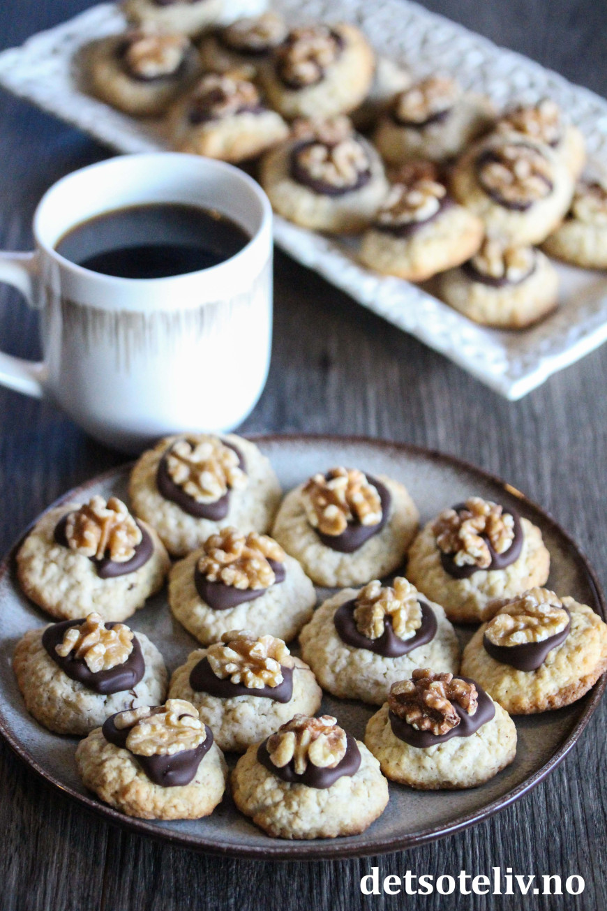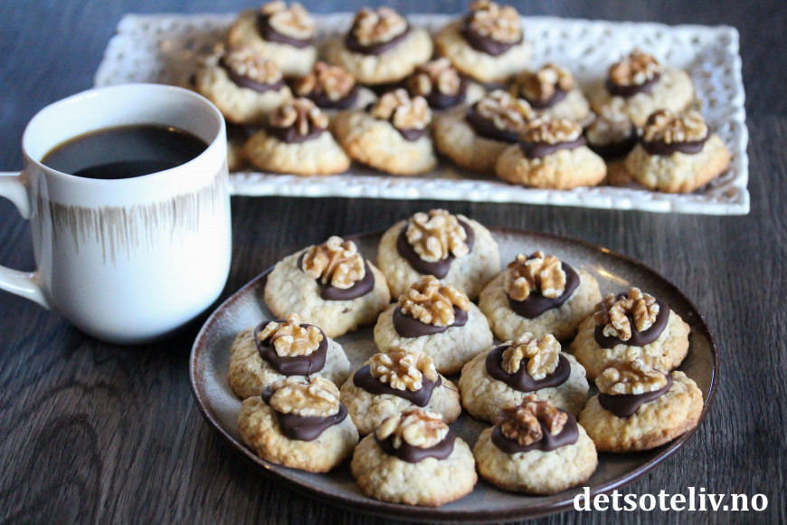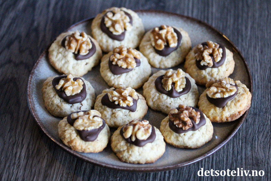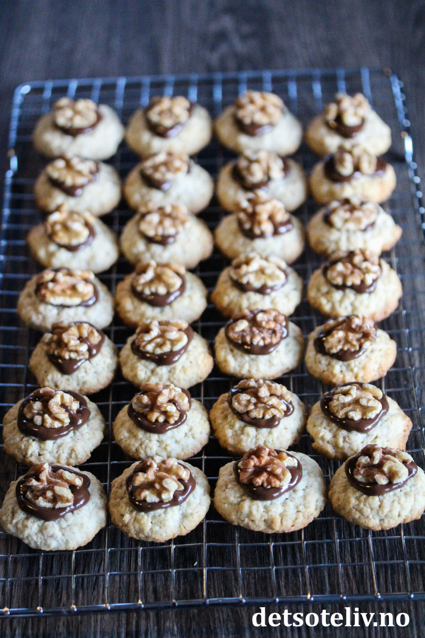 Pynt med smeltet kokesjokolade og fest valnøtter på toppen av kakene i den smeltede sjokoladen.