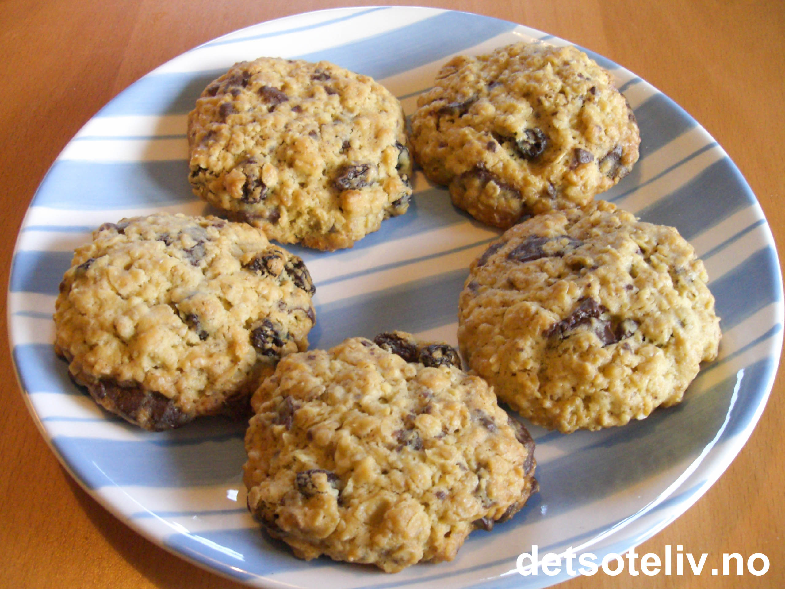 Pisk smør og sukker til luftig smørkrem. Pisk inn eggene. Rør inn vaniljesukker og bakepulver. Bland deretter inn havregryn, hakket kokesjokolade og rosiner.