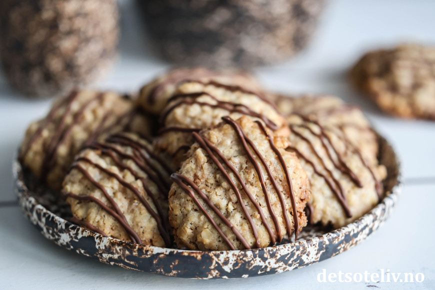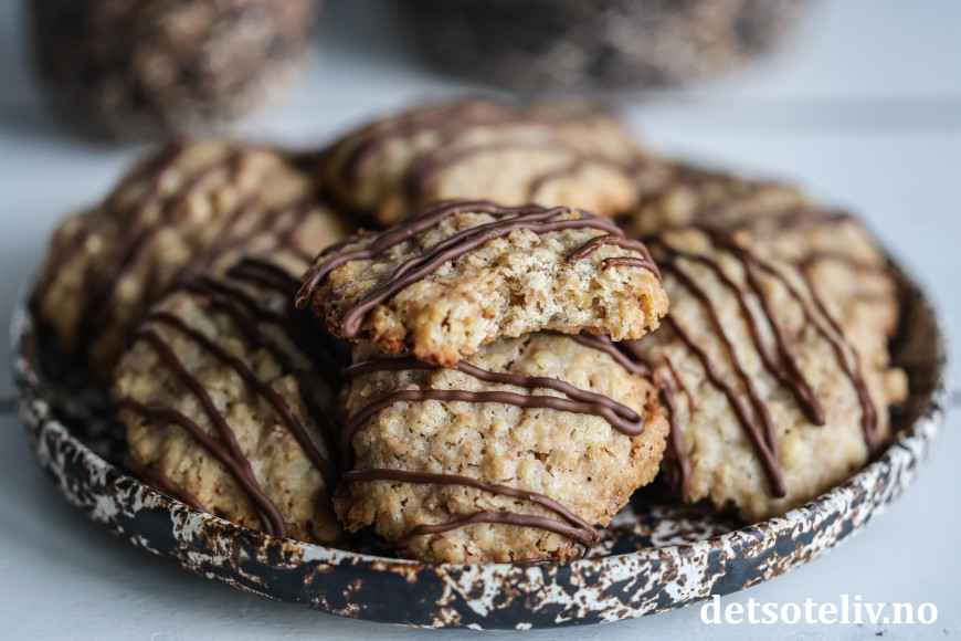Disse havremakronene er basert på en ordinær oppskrift på Havremakroner, men er gjort betydelig mer spennende ved hjelp av hakket sjokolade i deigen og smeltet sjokolade på toppen. 😉