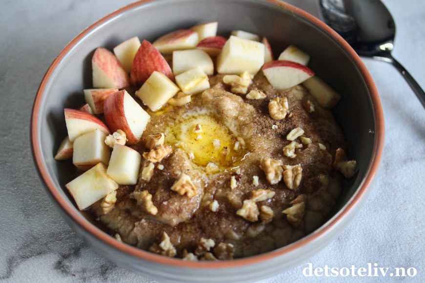 Dagens oppskrift er egentlig bare en reprise fra innlegget Havremelsgrøt med kanelsukker og nøtter fra i går, men jeg ville vise dere den andre toppingen jeg har dilla på for tiden, nemlig eplebiter og valnøtter (i tillegg til smørklatt og kanelsukker )