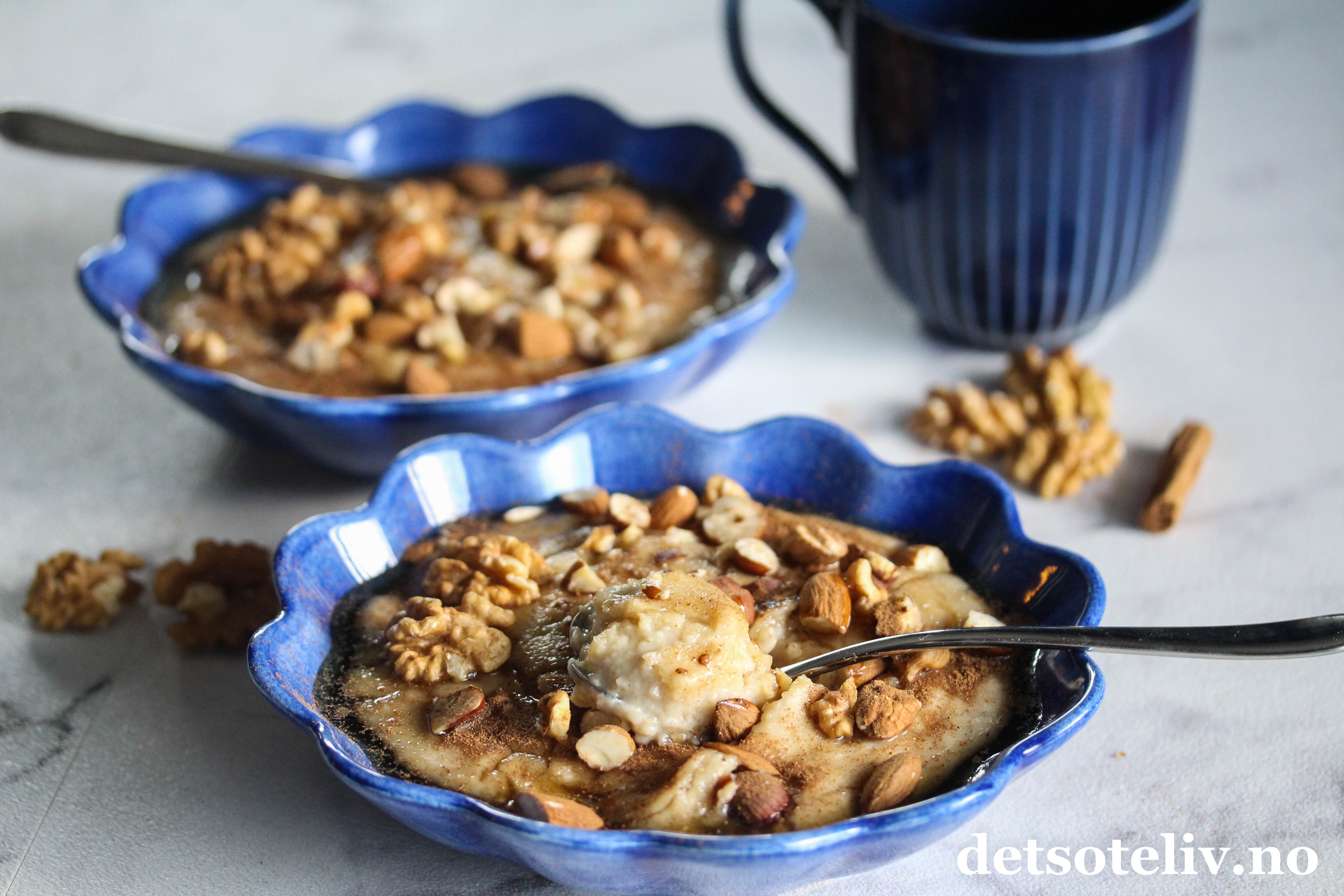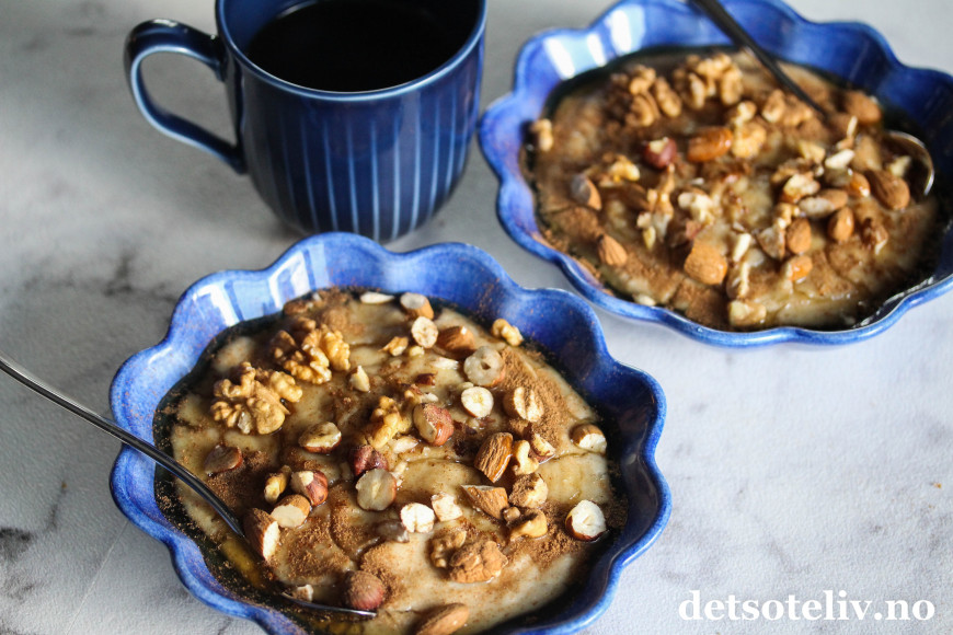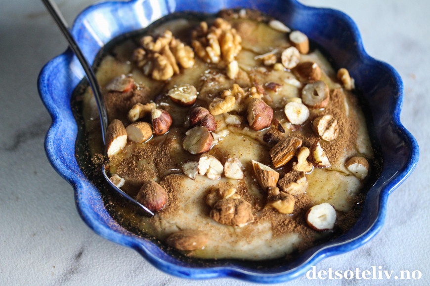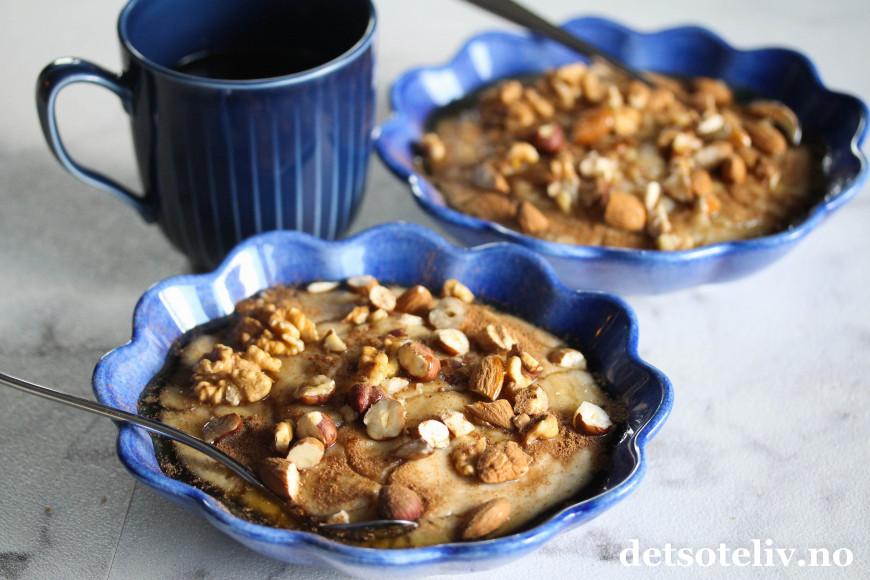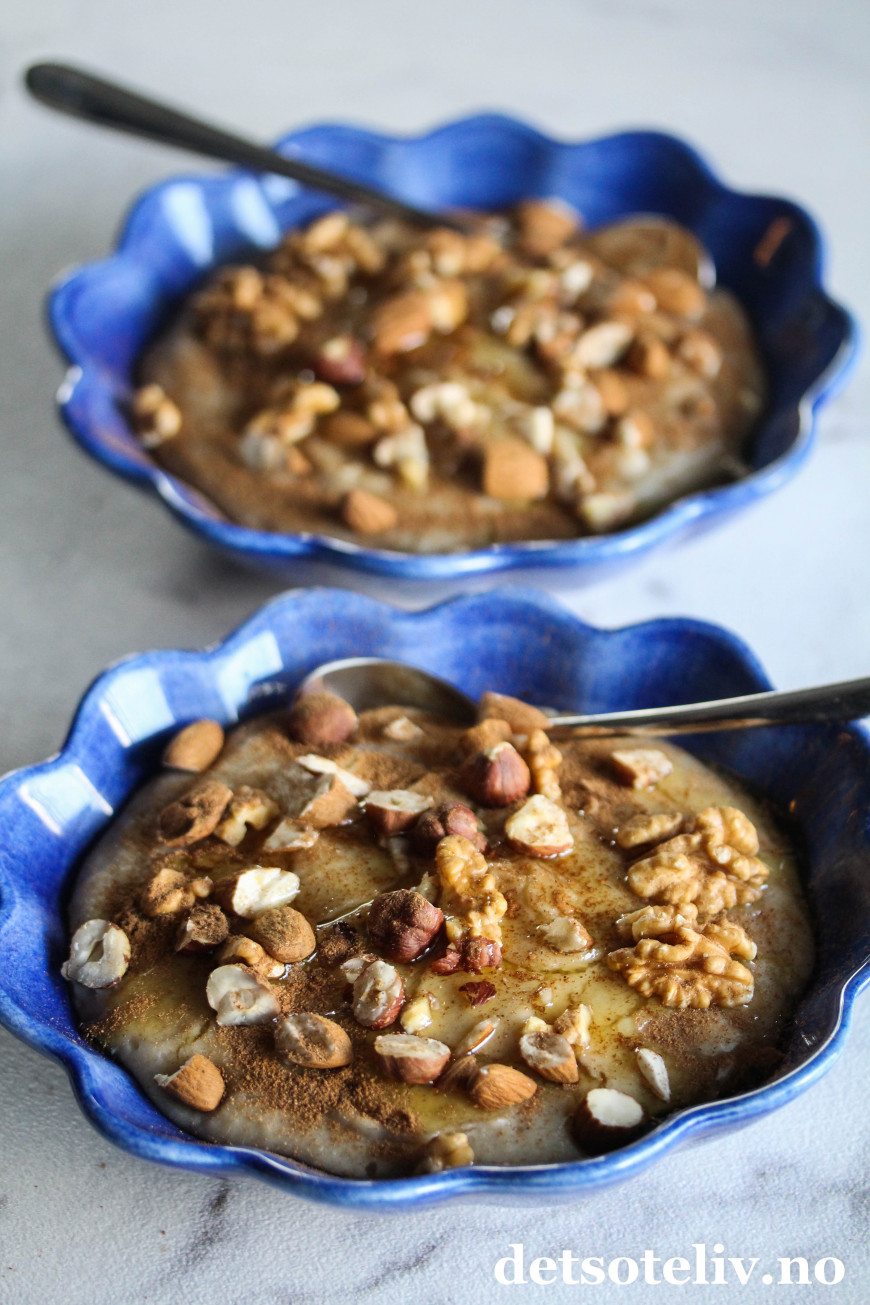 Her har jeg toppet skålene med en god smørklatt (som smeltet umiddelbart fordi grøten var så varm), sukker og masse kanel og deretter en blanding av grovt hakkede hasselnøtter, mandler og valnøtter.
