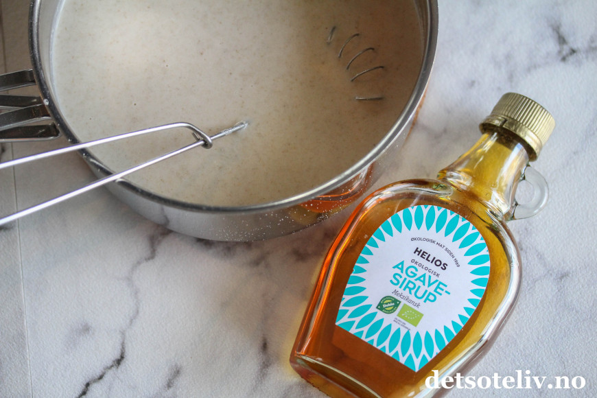 ♥ Jeg har her søtet havremelsgrøten med agavesirup, som er en naturlig sirup som egner seg bra for veganere. Annen søtning kan såklart brukes i stedet, enten det er lønnesirup, honning, sukrin eller vanlig hvitt eller brunt sukker. Du kan også droppe søtning i selve grøten og kun ha det på toppen av grøten.