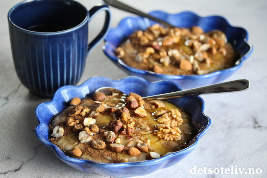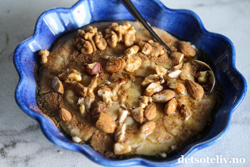 Fløyelsmyk havremelsgrøt er perfekt som babymat, men veldig godt også for voksne! Spesielt nydelig blir havremelsgrøten med ulike typer toppinger. Her har jeg brukt smørklatt (som smelter raskt i kontakt med den varme grøten), rikelig med kanelsukker og en blanding ulike grovt hakkede nøtter (grøten mister da også sitt babymatpreg).