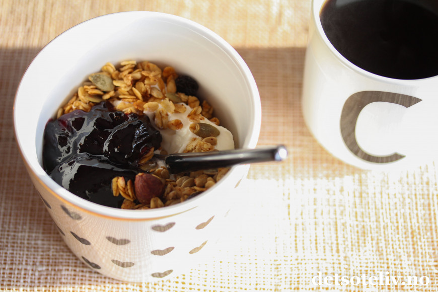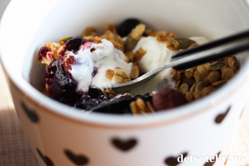 Min favoritt er å kombinere havremüslien med gresk yoghurt og blåbærsyltetøy..