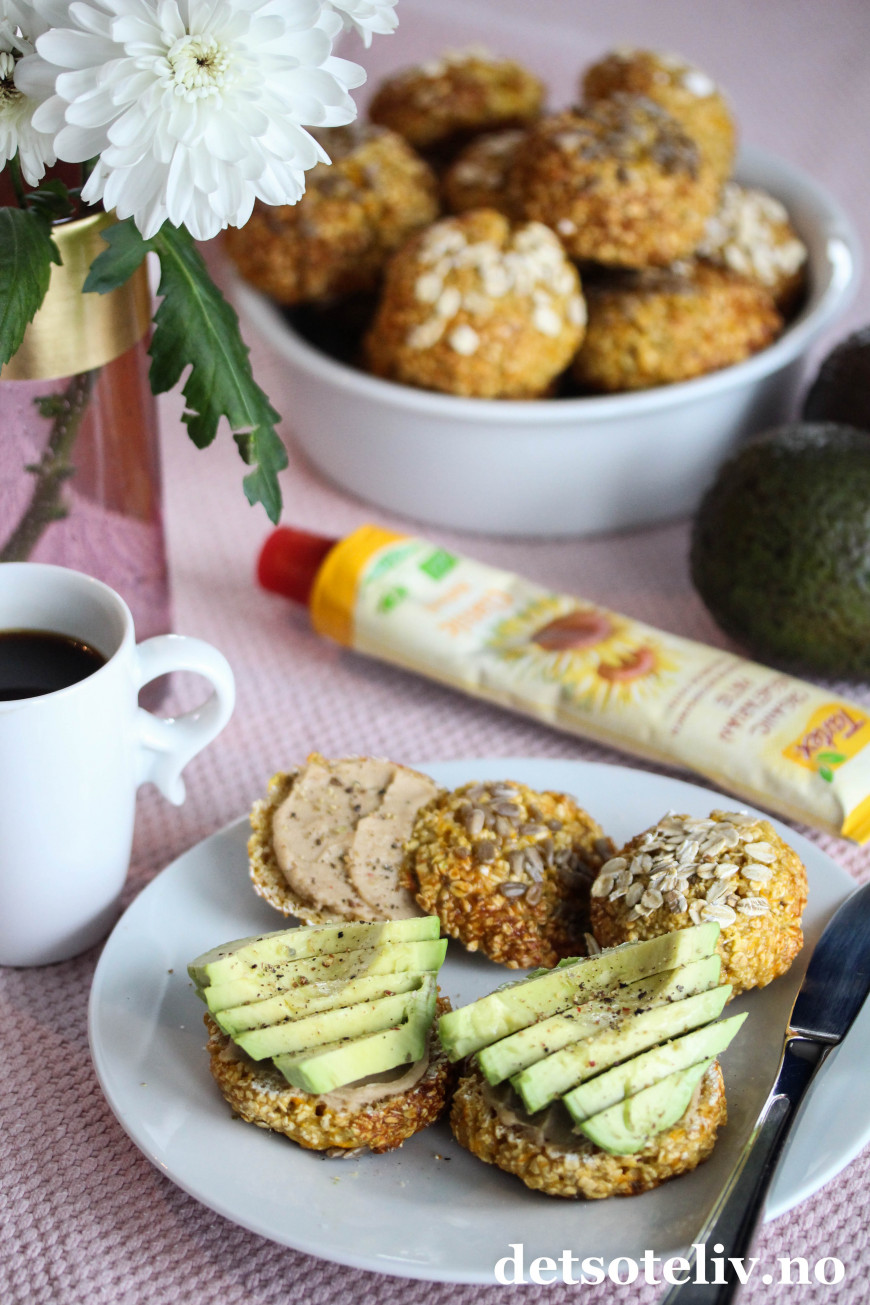 Jeg drysser solsikkerkjerner på halvparten og store havregryn på resten for variasjonens skyld, men bruk det du liker best!