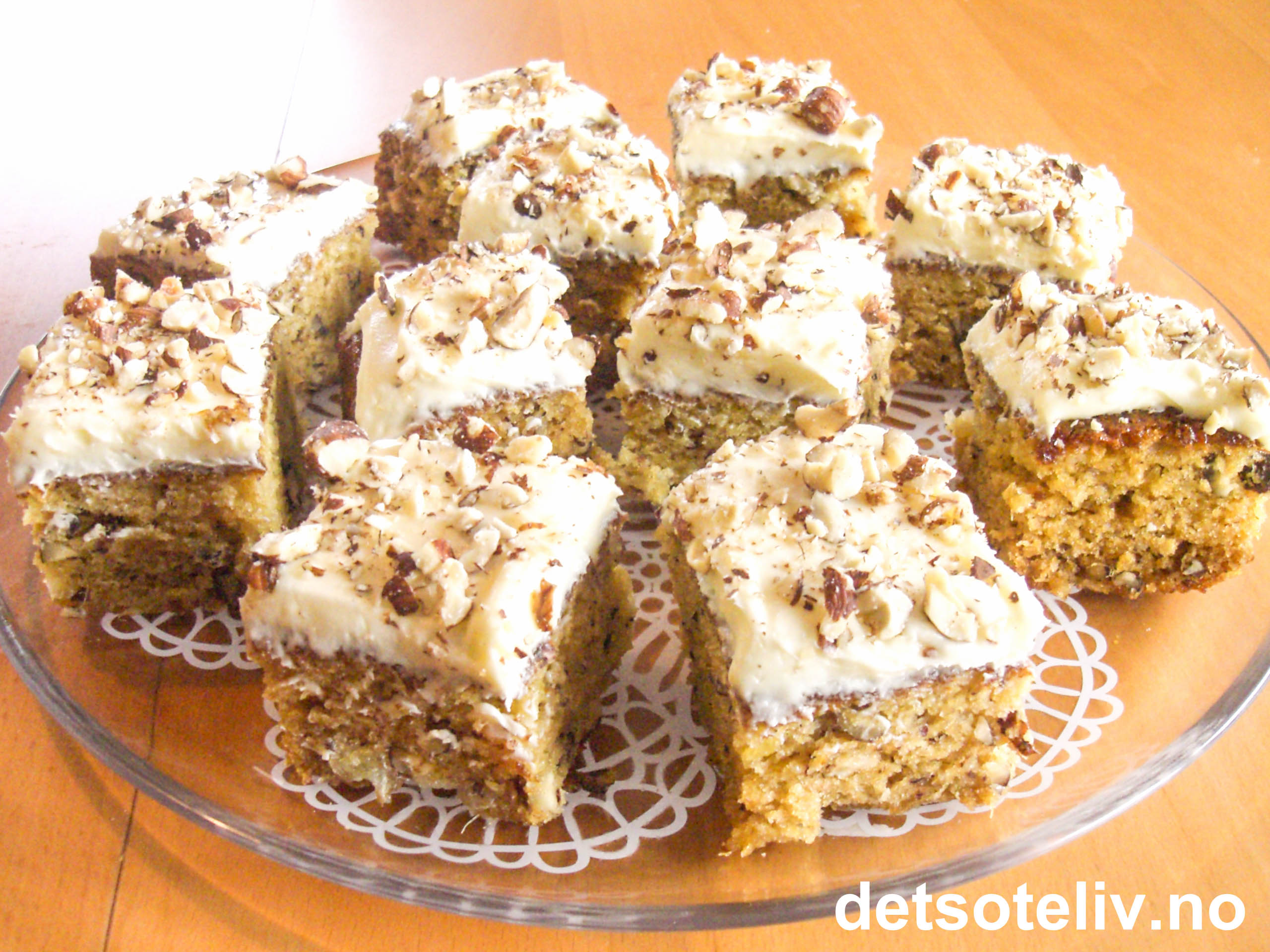 Pisk sammen ingrediensene til ostekremen. Smør ostekremen jevnt over kaken. Dryss eventuelt over hakkede nøtter og del kaken opp i firkanter.