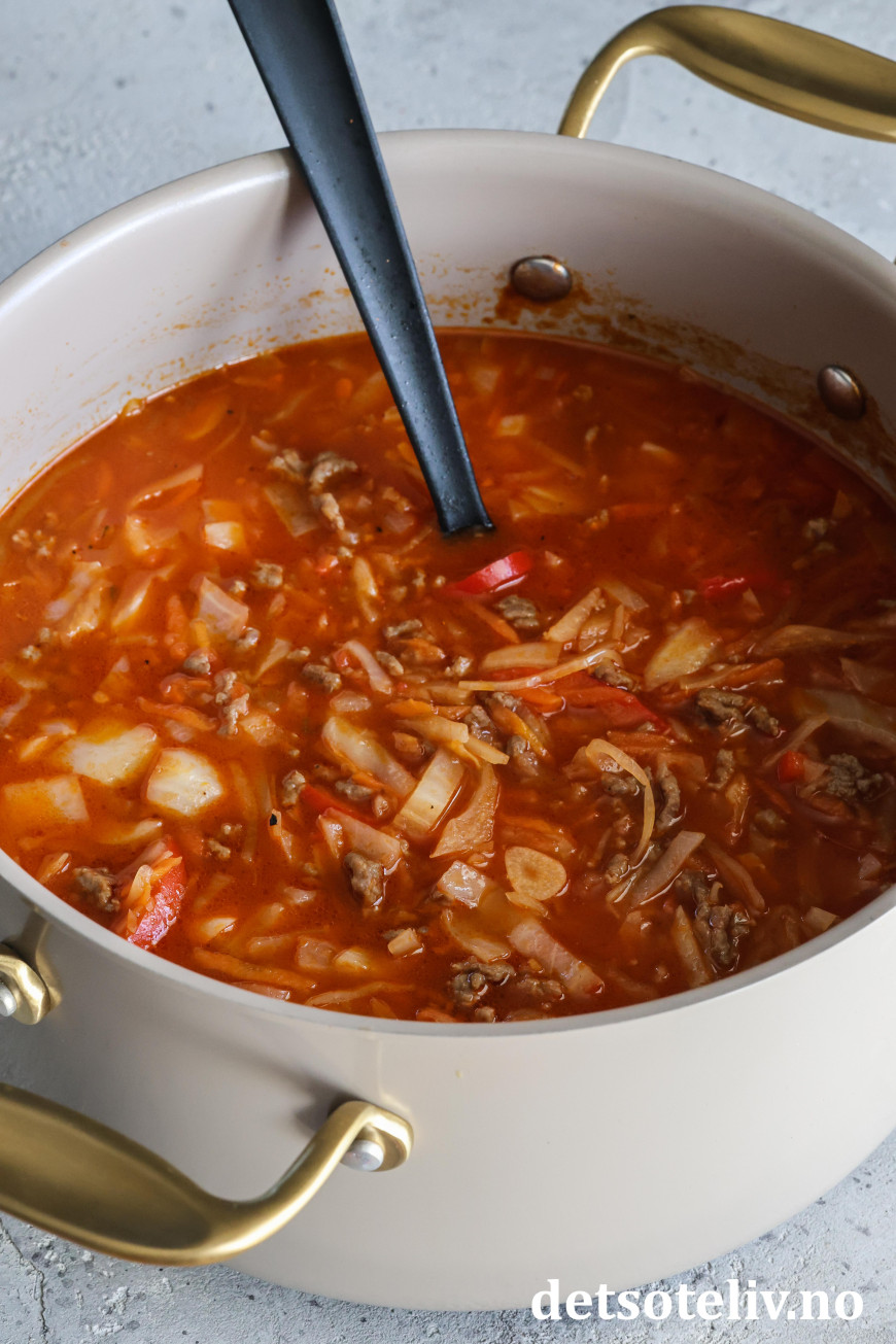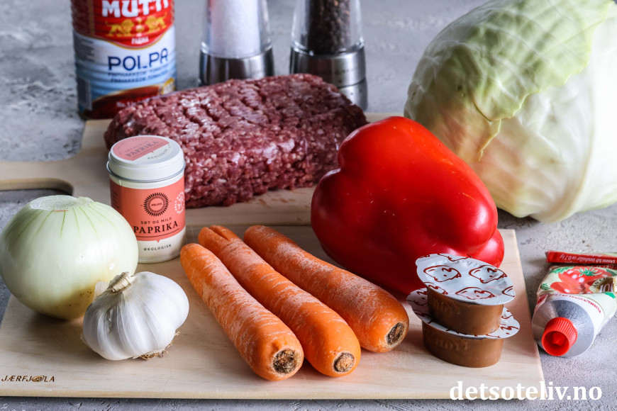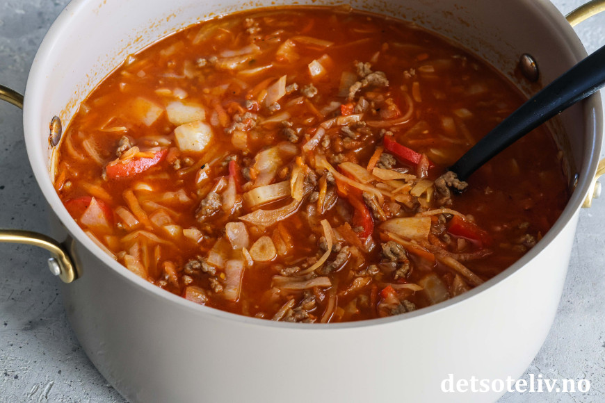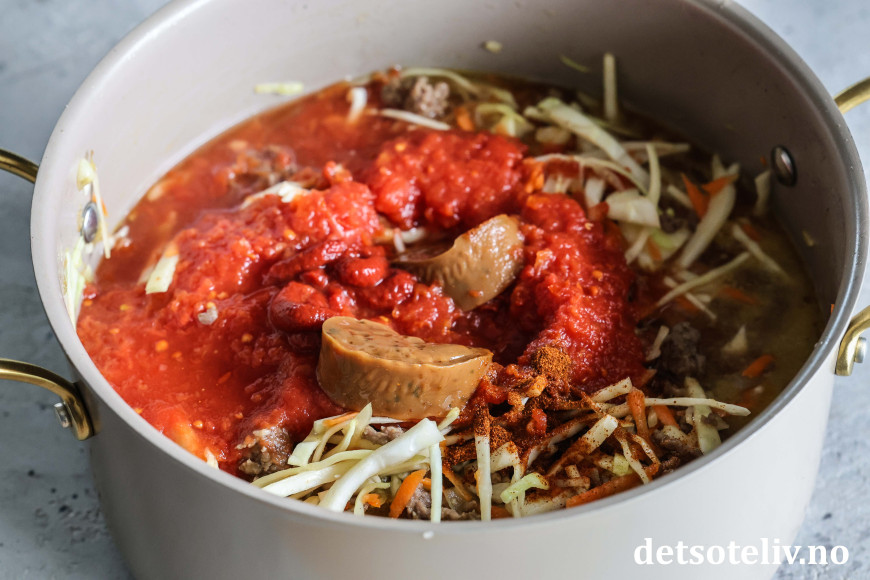 Stimle kålen og rasp gulrøttene grovt. Ha dette i kjelen. Tilsett hakkede, hermetiske tomater, tomatpuré, kjøttfond og paprikapulver.