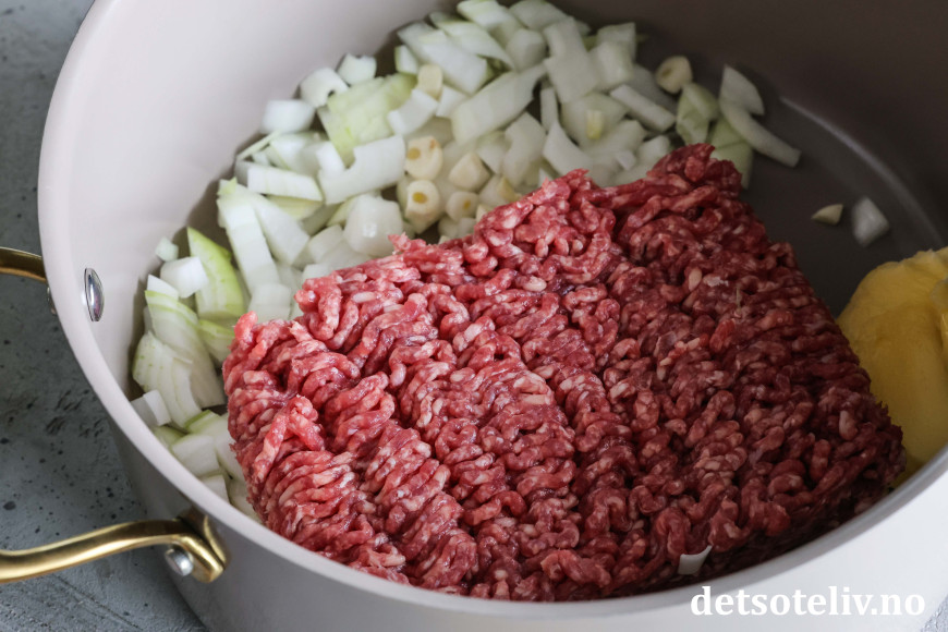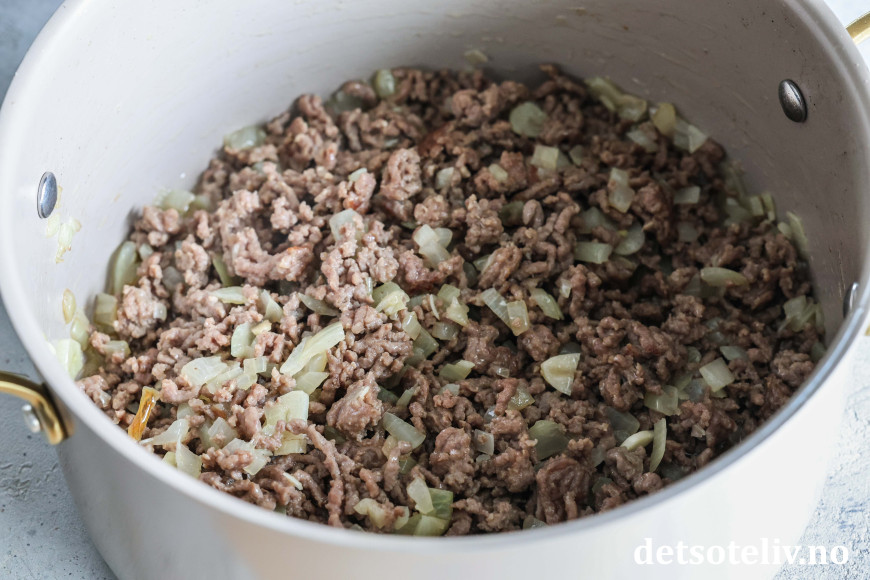 Ha smør i en nokså stor kjele (ca. 4 liter). Hakk løk og hvitløksfedd og ha i kjelen sammen med kjøttdeig.