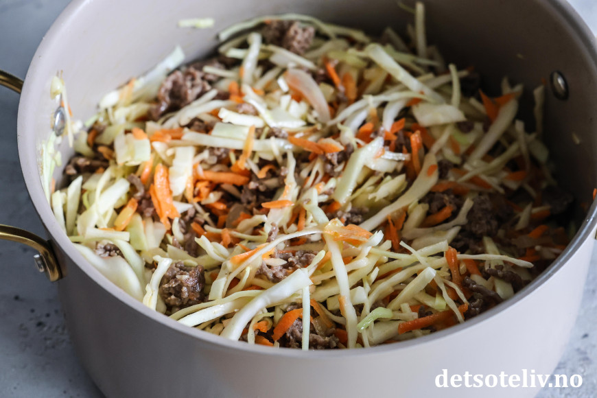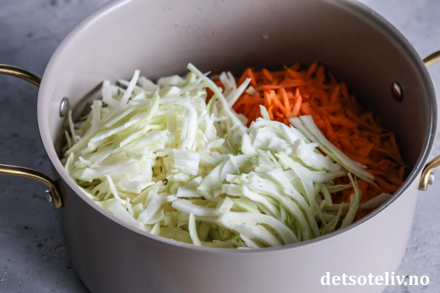 Stimle kålen og rasp gulrøttene grovt. Ha dette i kjelen.