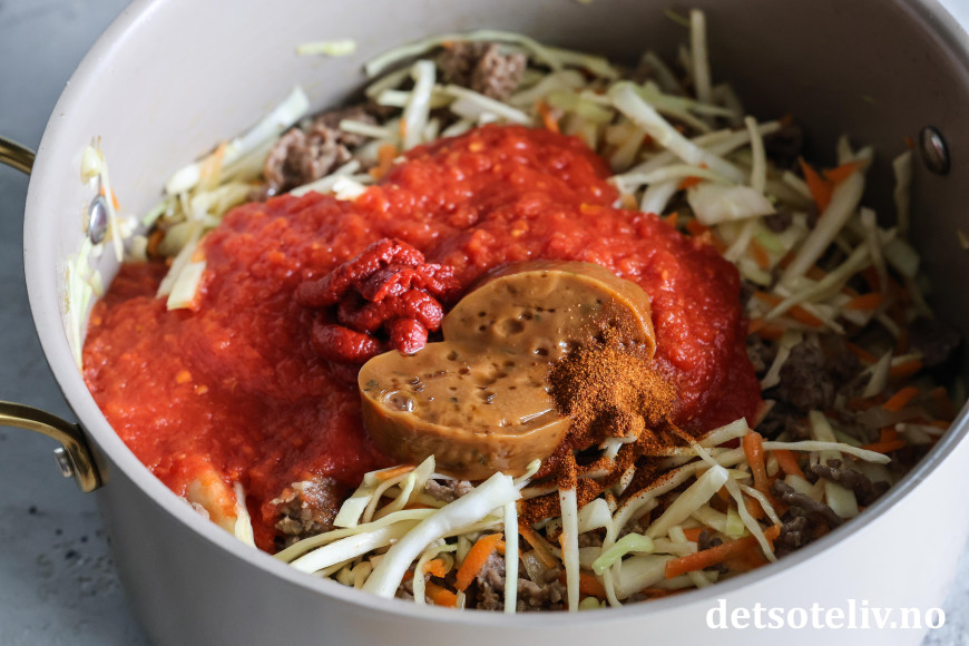 Tilsett hakkede, hermetiske tomater, tomatpuré, kjøttfond og paprikapulver.