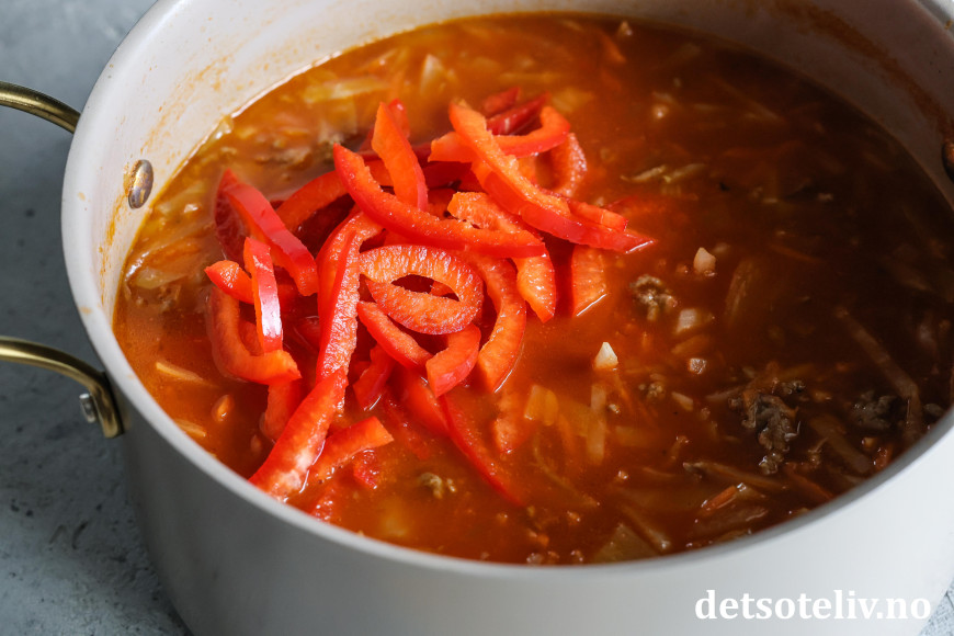 Skjær paprikaen i tynne strimler og tilsett. La suppen småkoke i 5–10 minutter til. Spe med litt mer vann dersom du synes at suppen virker for tykk.