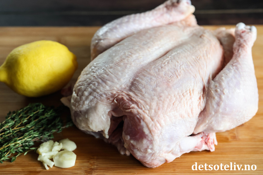 Vask kyllingen godt under rennende, kaldt vann, og vær nøye med å også vaske den godt inni. Tørk av kyllingen med kjøkkenpapir og legg den på en fjøl. Finn frem sitron, hvitløk og timian.