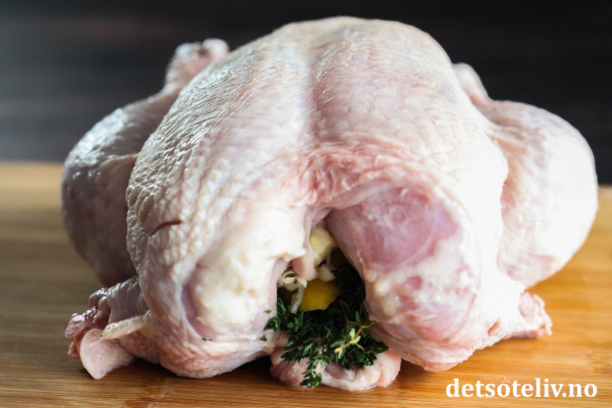 Ta kyllingen ut av kjøleskapet en halvtime før du starter med å tilberede den, slik at den er romtemperert.
