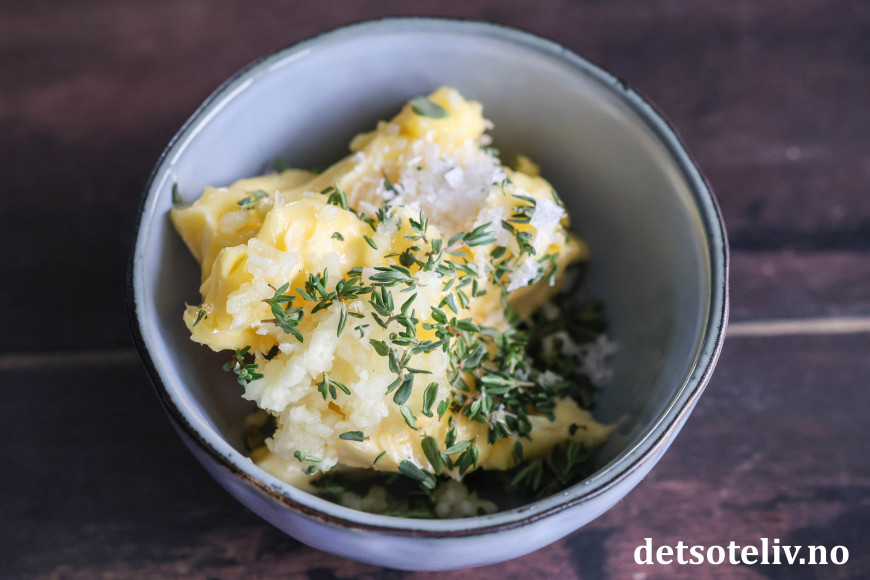 Ha mykt, romtemperert smør i en skål sammen med pressede hvitløksfedd, frisk timian og maldonsalt.