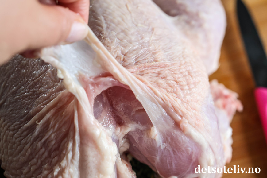 Bruk en skarp kniv til å forsiktig snitte opp en åpning under skinnet på kyllingen.