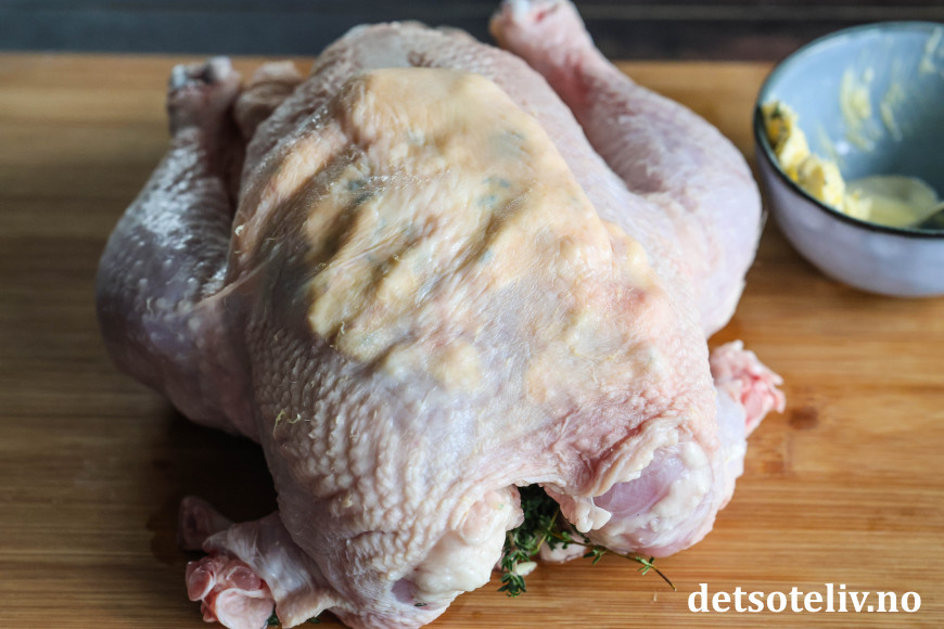Et triks for å få ekstra saftig og smakfull kylling, er å legge godt med hvitløkssmør under skinnet på kyllingen før steking.