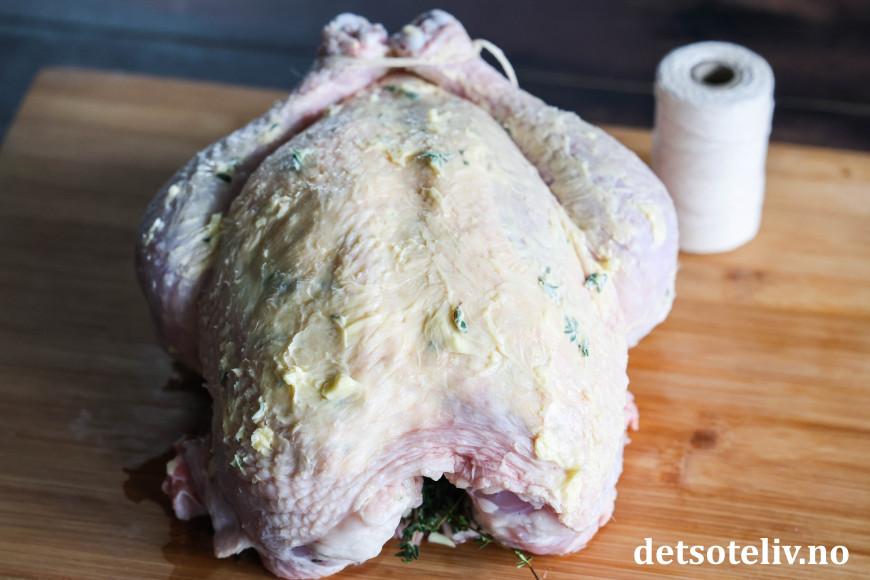 Gni resten av hvitløkssmøret utenpå skinnet på kyllingen.